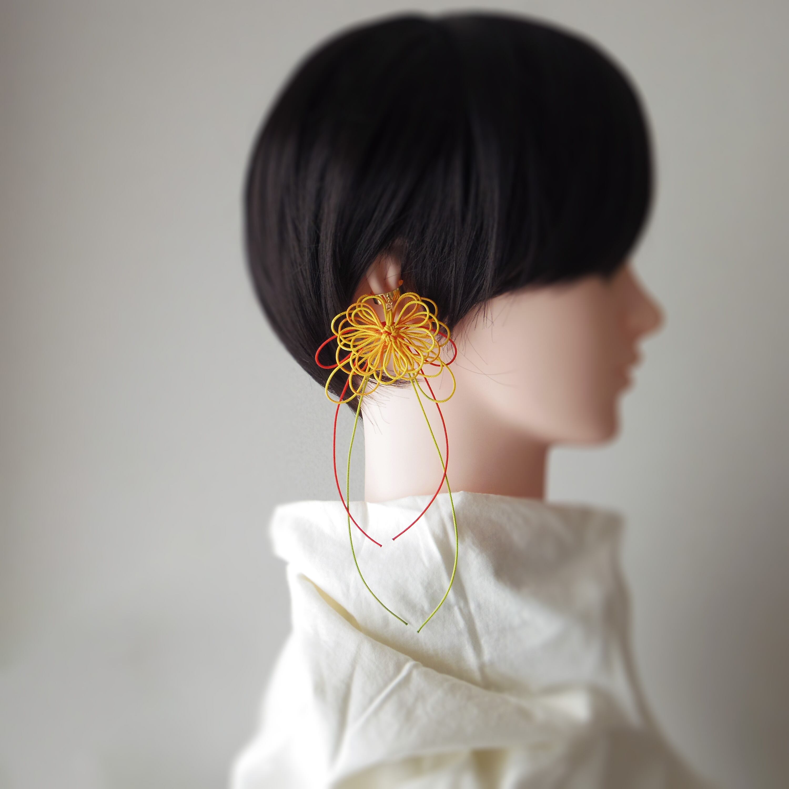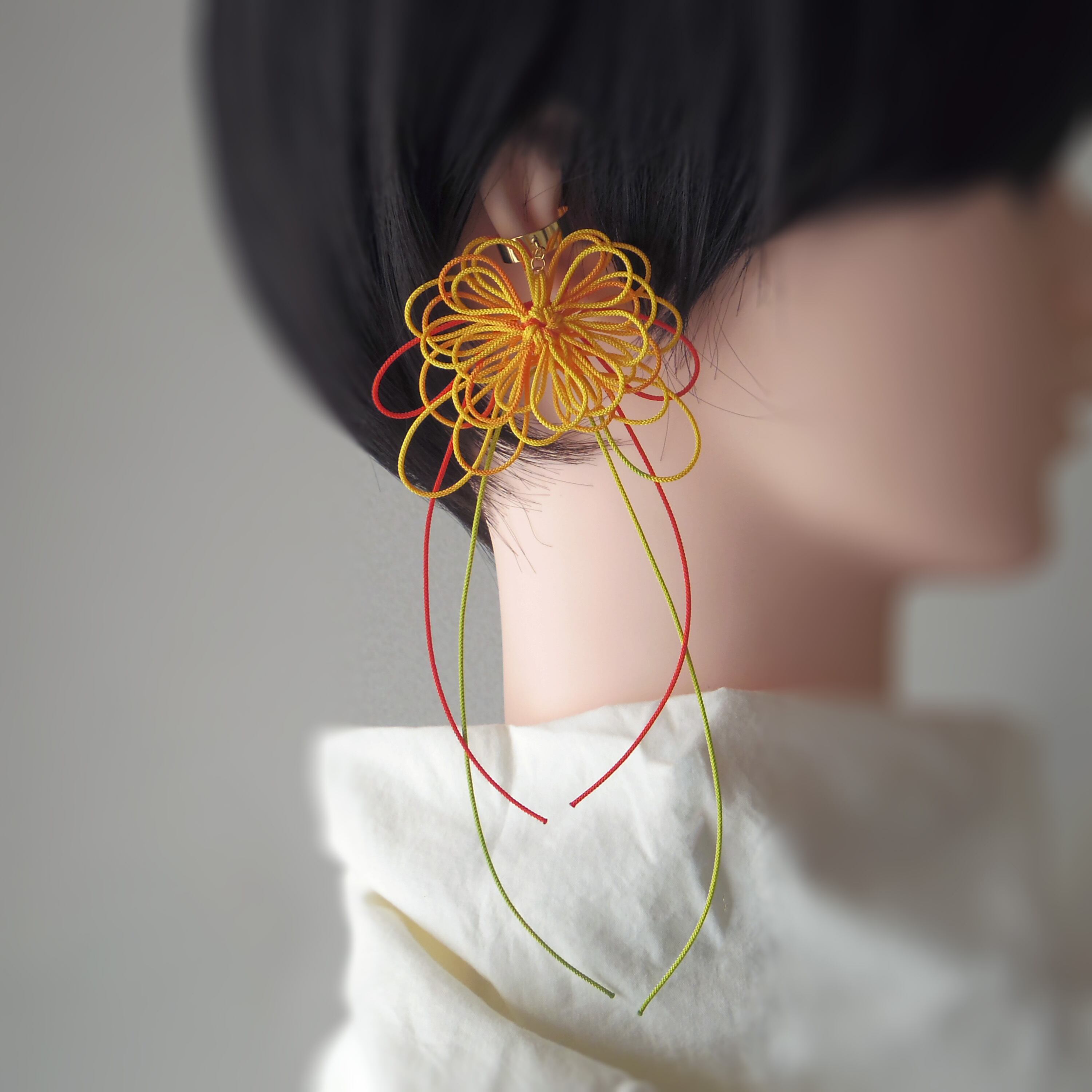 ※飾り結びは非常に繊細です。手に取る場合は必ずイヤーカフパーツのみを掴むようにし、飾り結びを直接つかんだり引っ張ったりしないでください。特に着脱時はご注意ください※