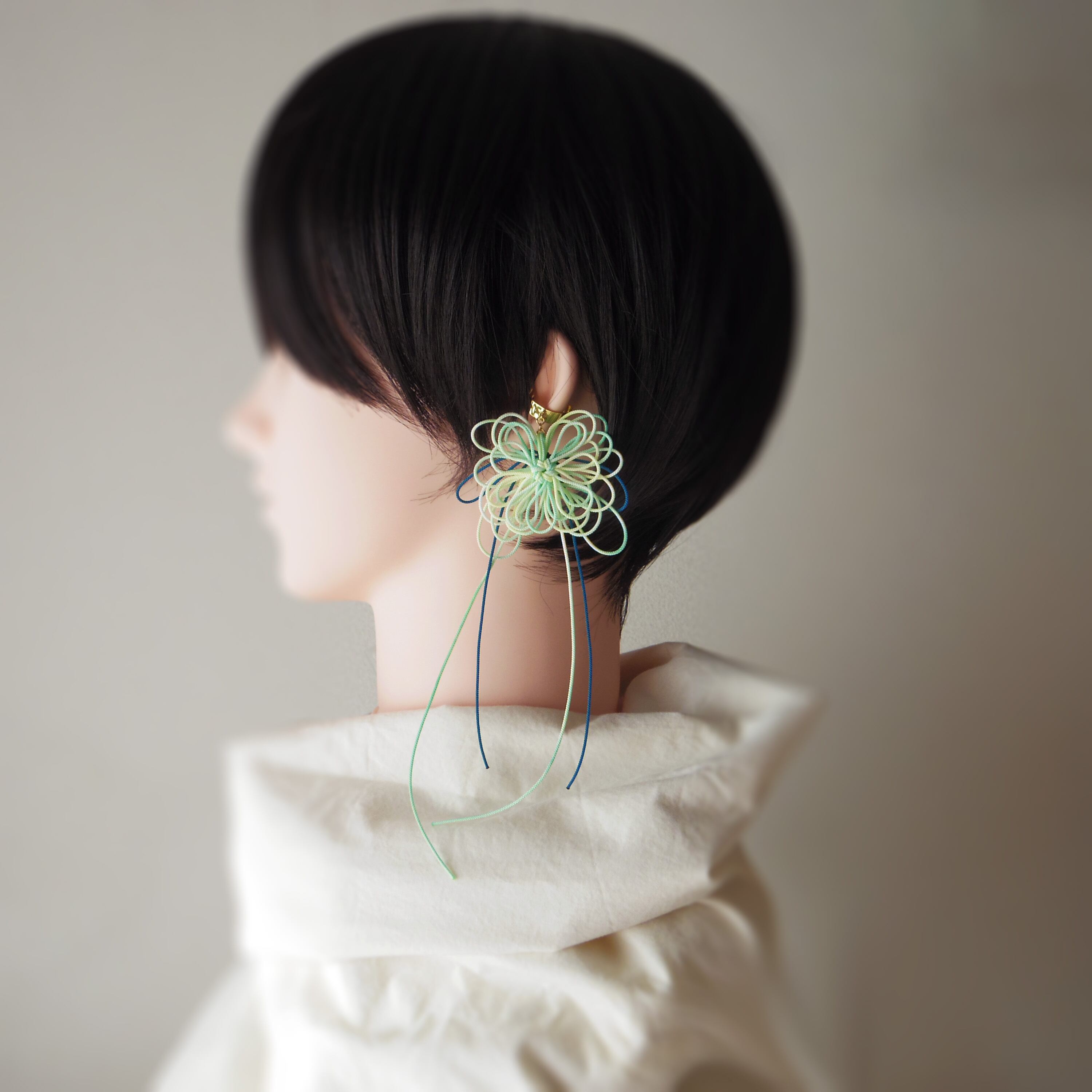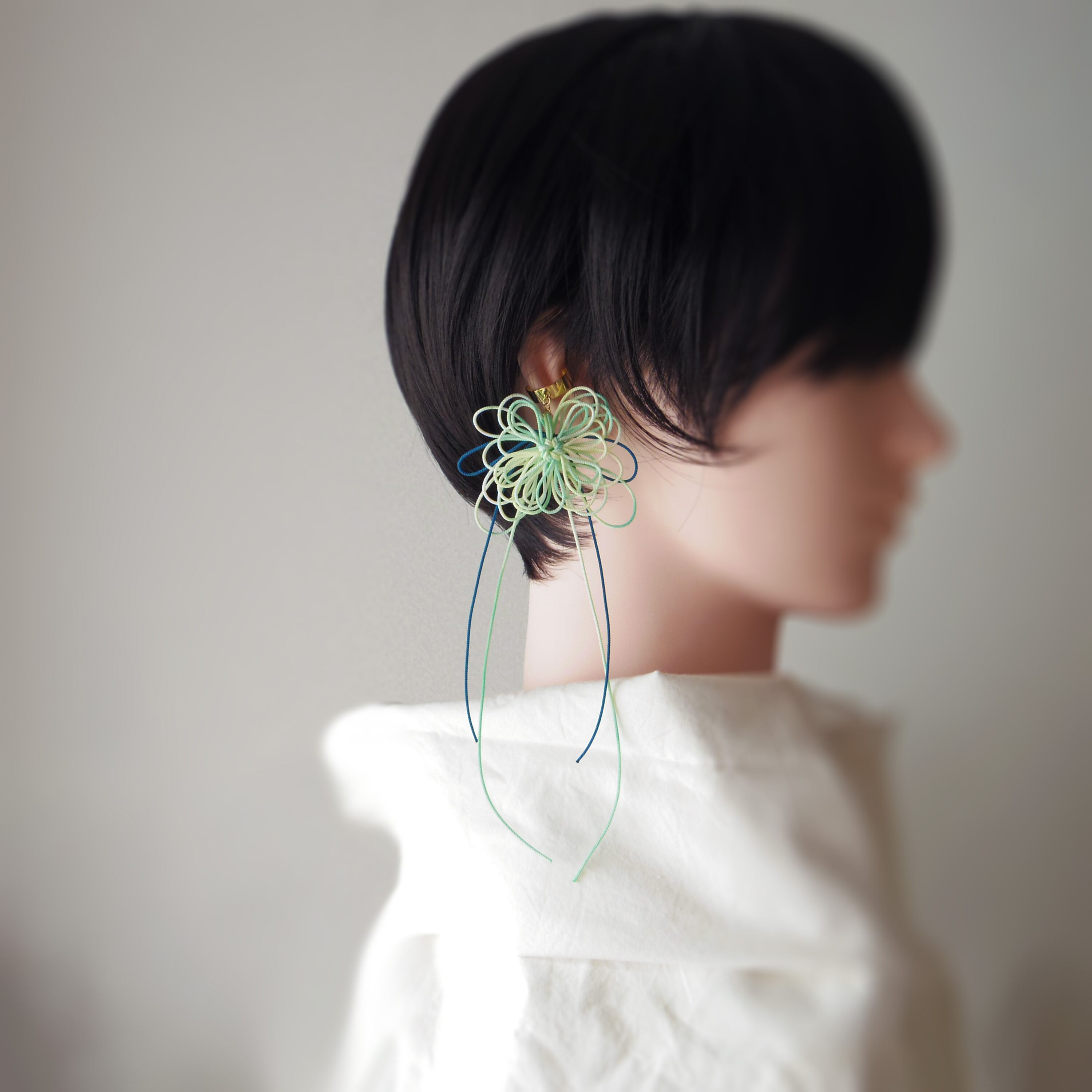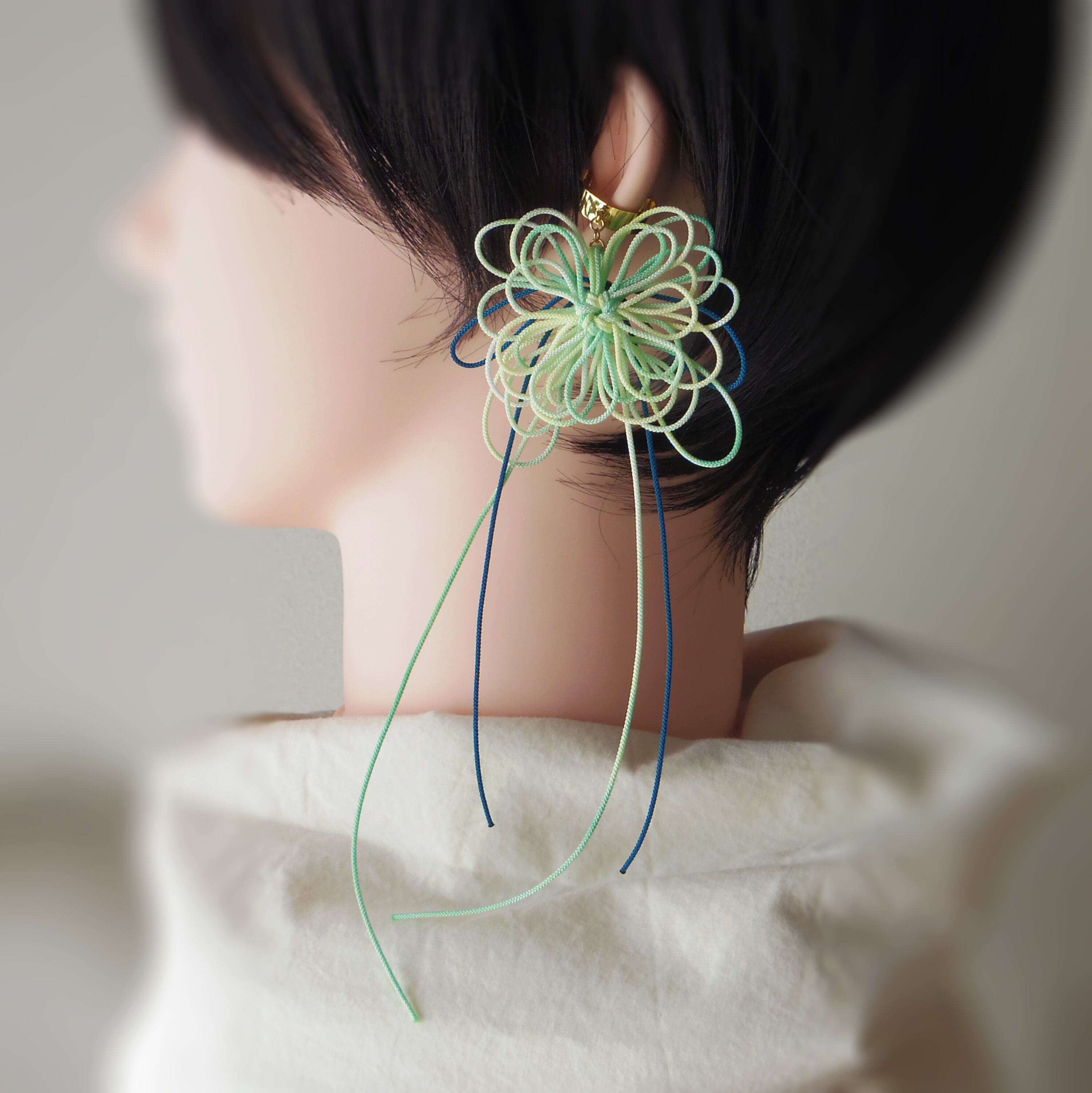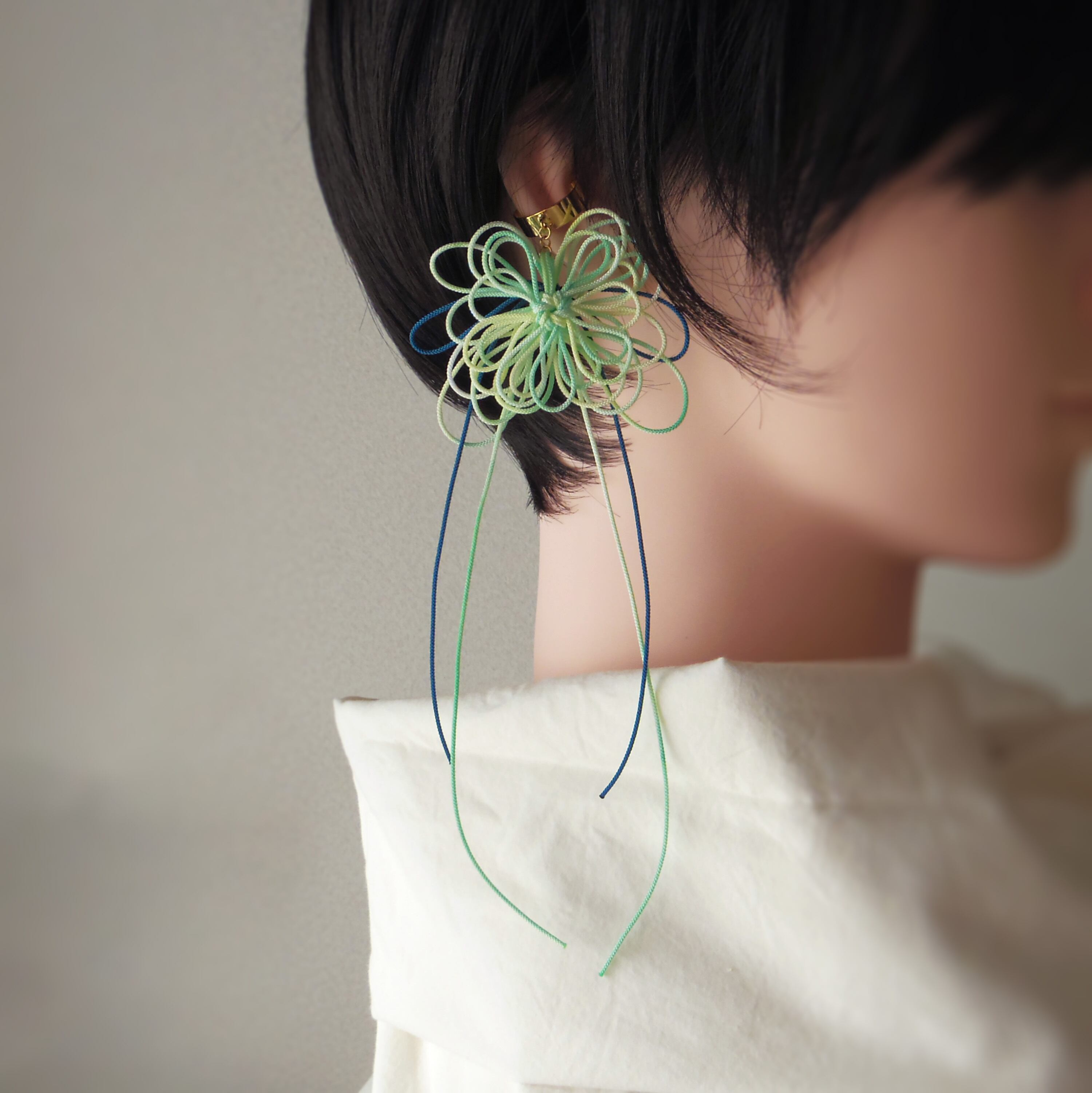 ※飾り結びは非常に繊細です。手に取る場合は必ずイヤーカフパーツのみを掴むようにし、飾り結びを直接つかんだり引っ張ったりしないでください。特に着脱時はご注意ください※