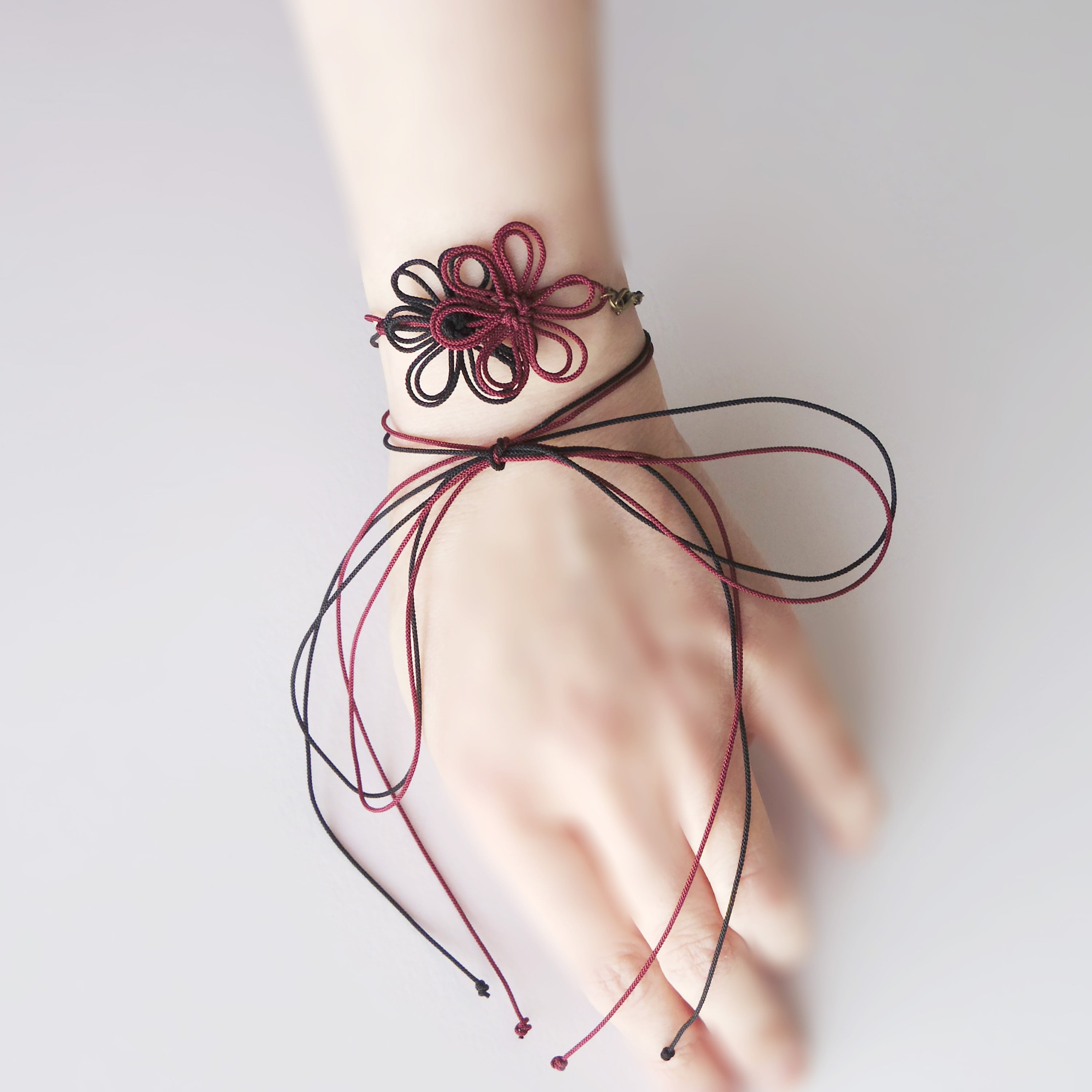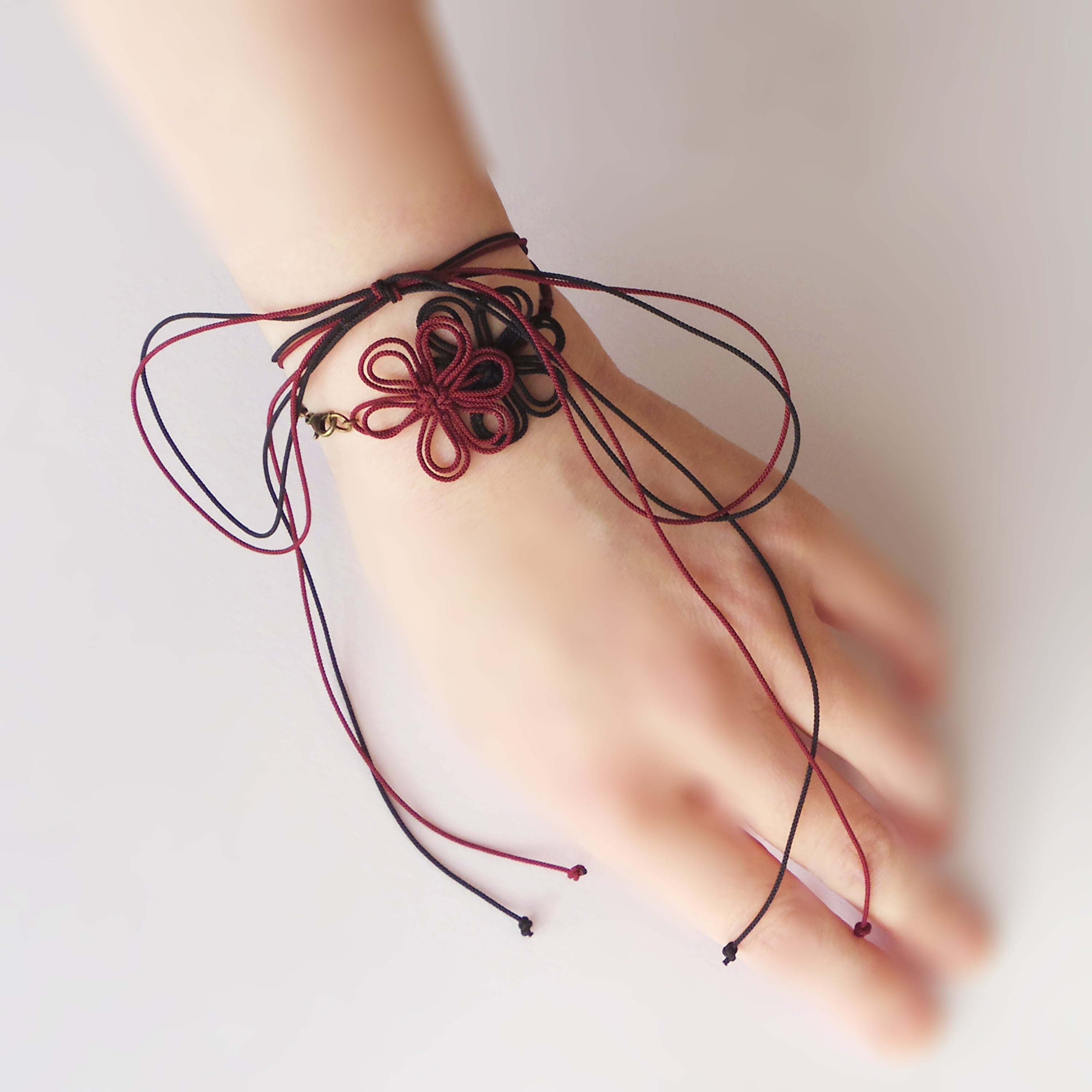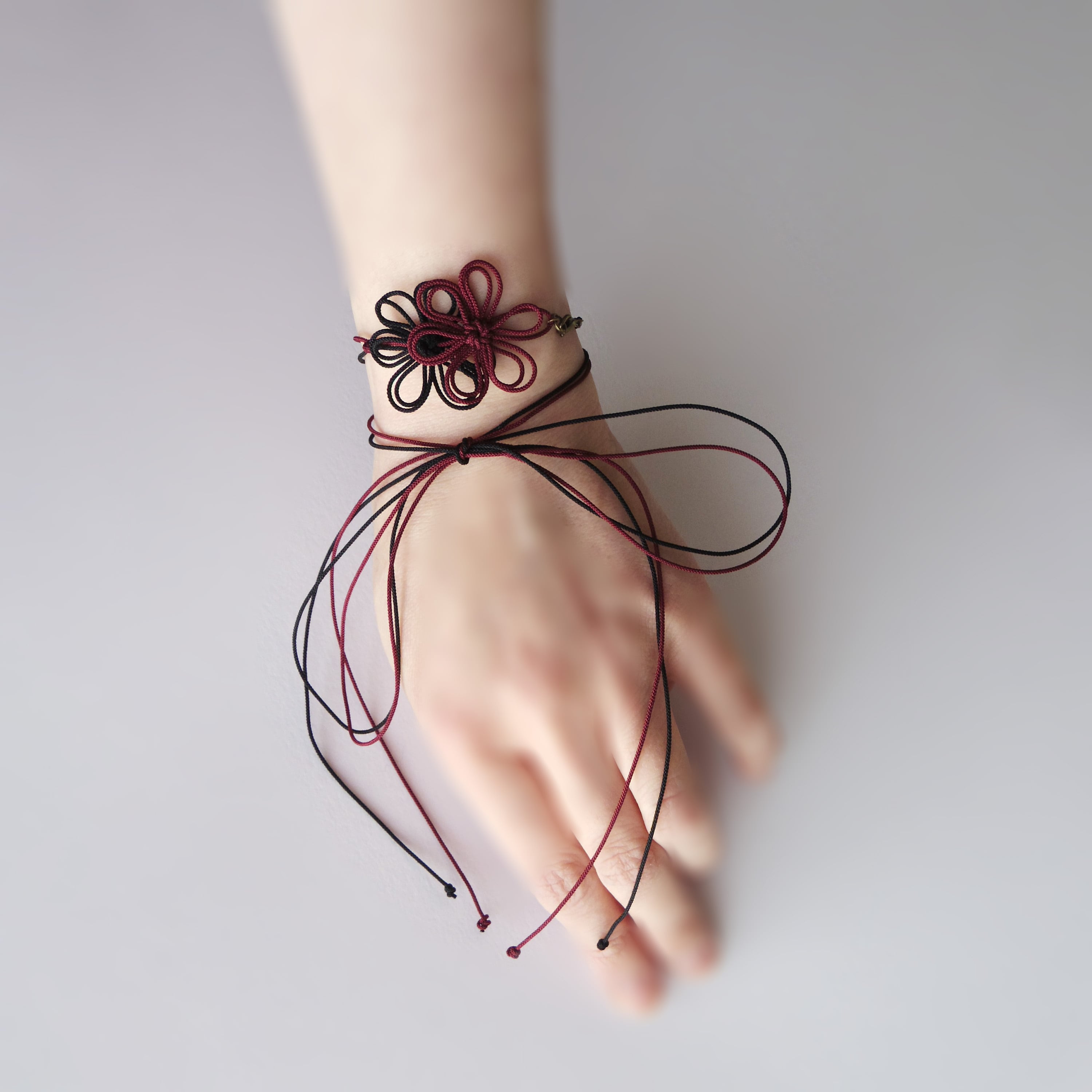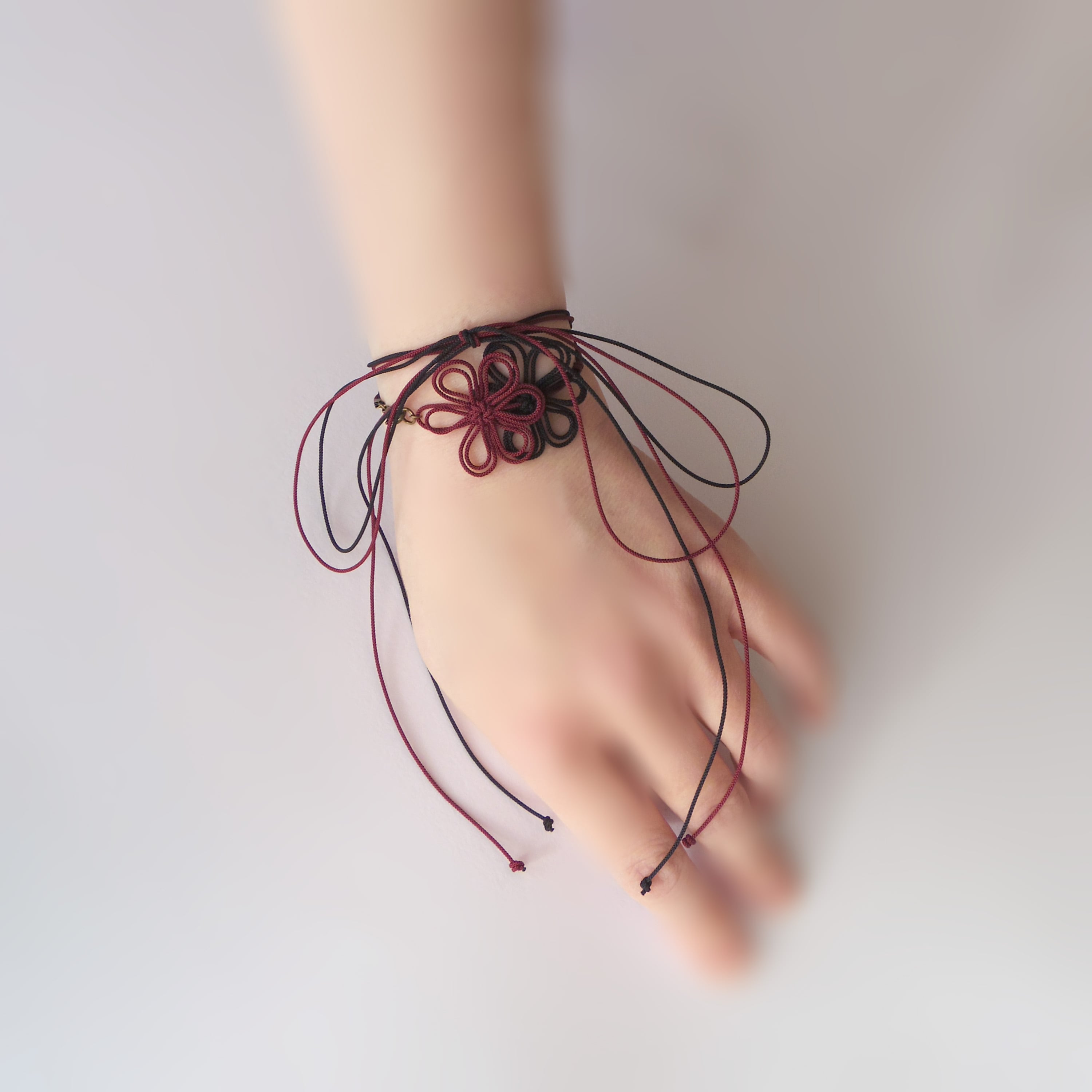 A delicate bracelet featuring dainty decorative knots crafted from ultra-fine cords.