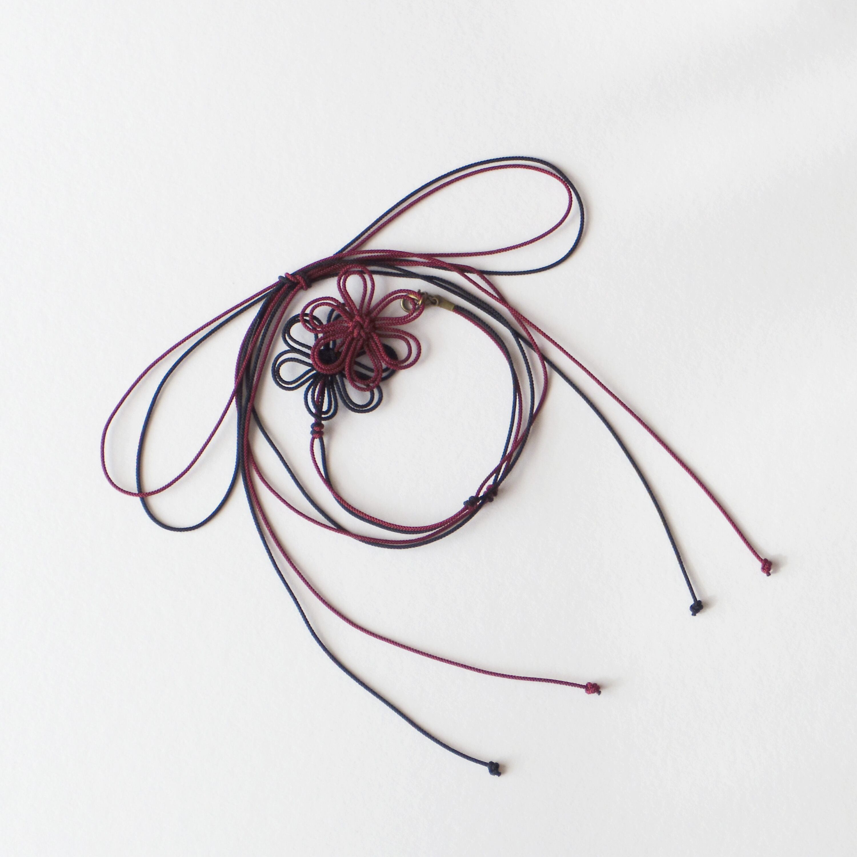 ※ほどくと長く一本になるので色々なアレンジが考えられますが、留め具が目立ってしまうのでチョーカーとしてのご使用はあんまりお勧めできません。また、飾り結びはとても繊細なので強く引っ張る力がかかるような使い方はできません※