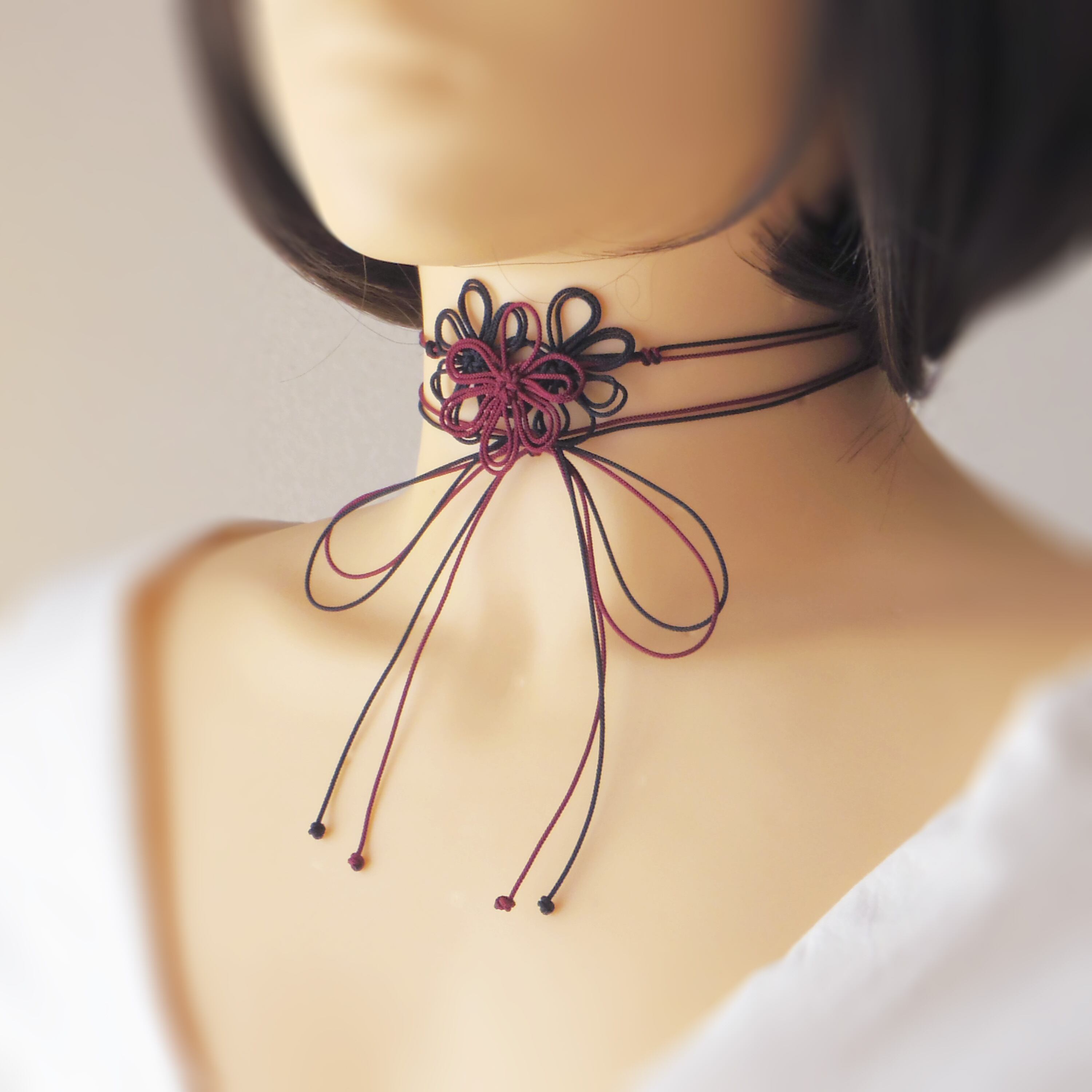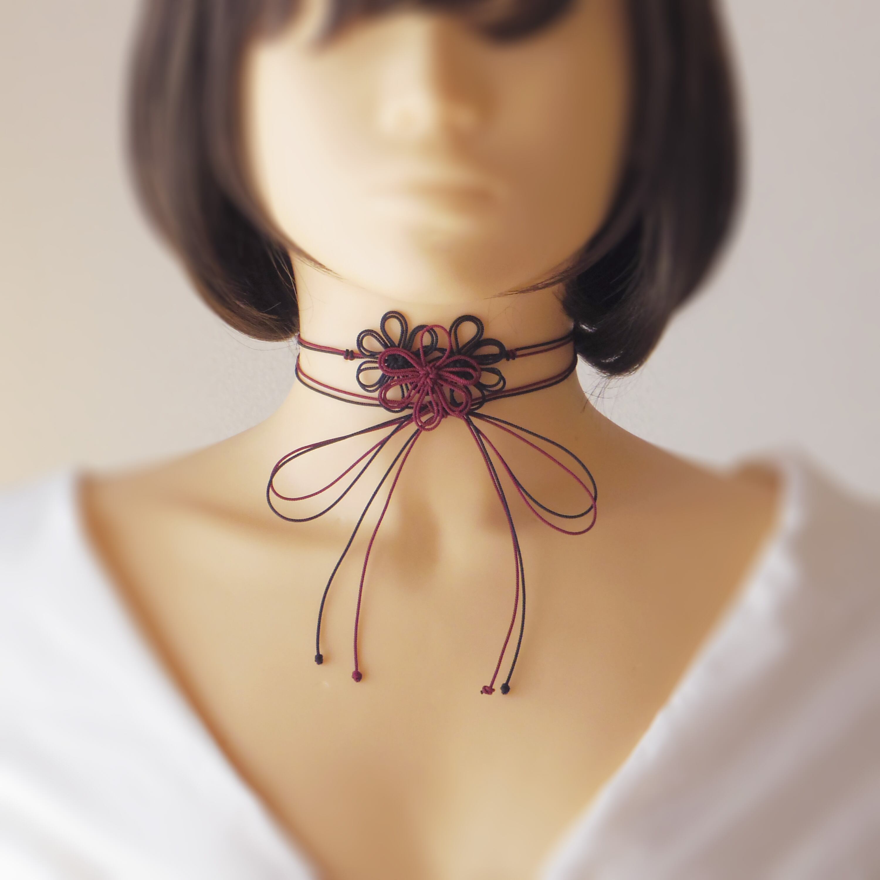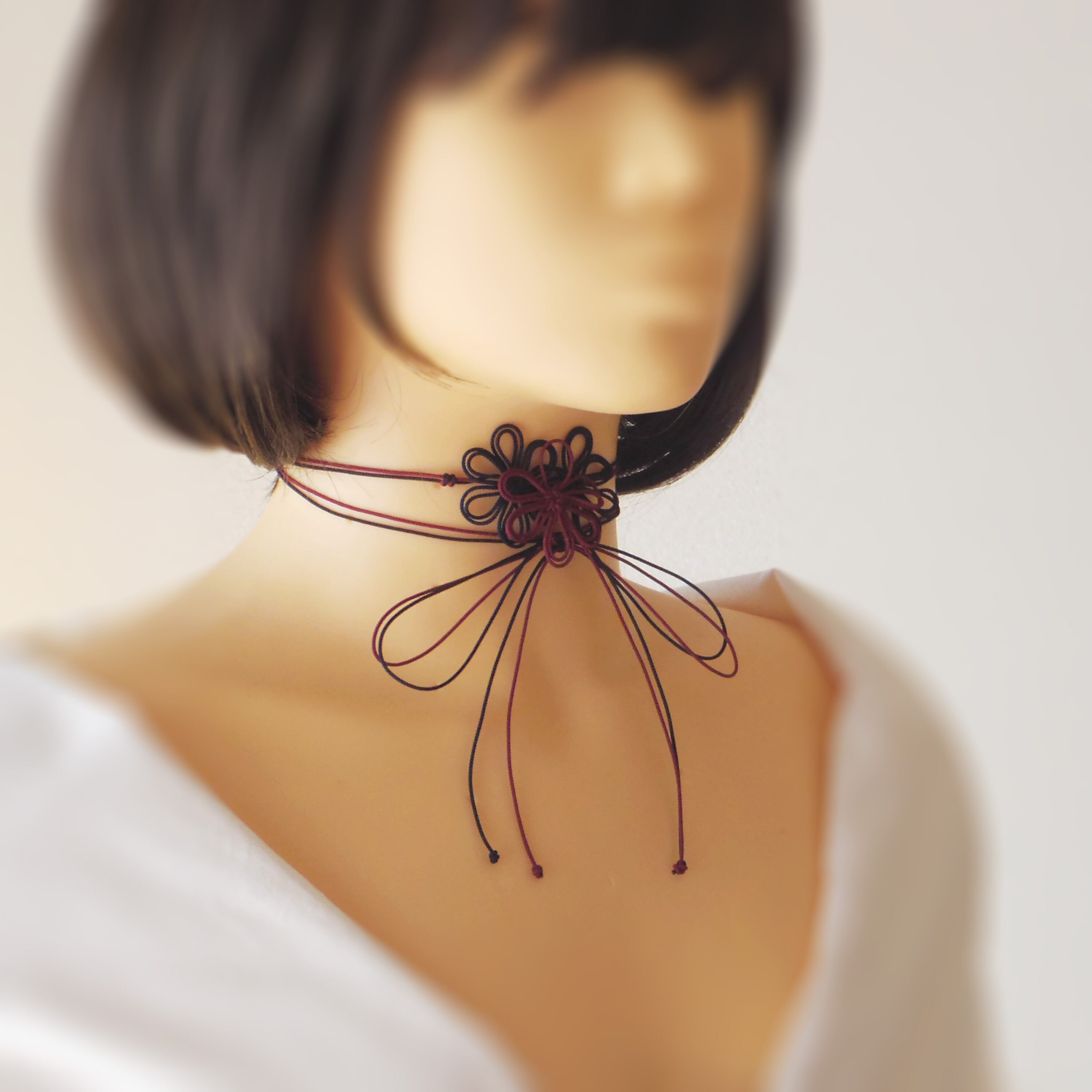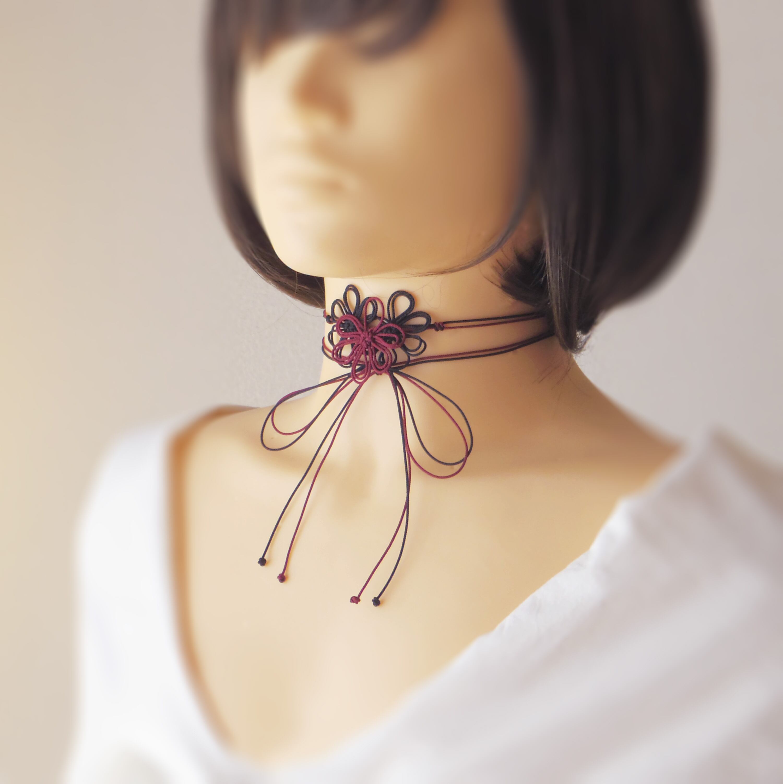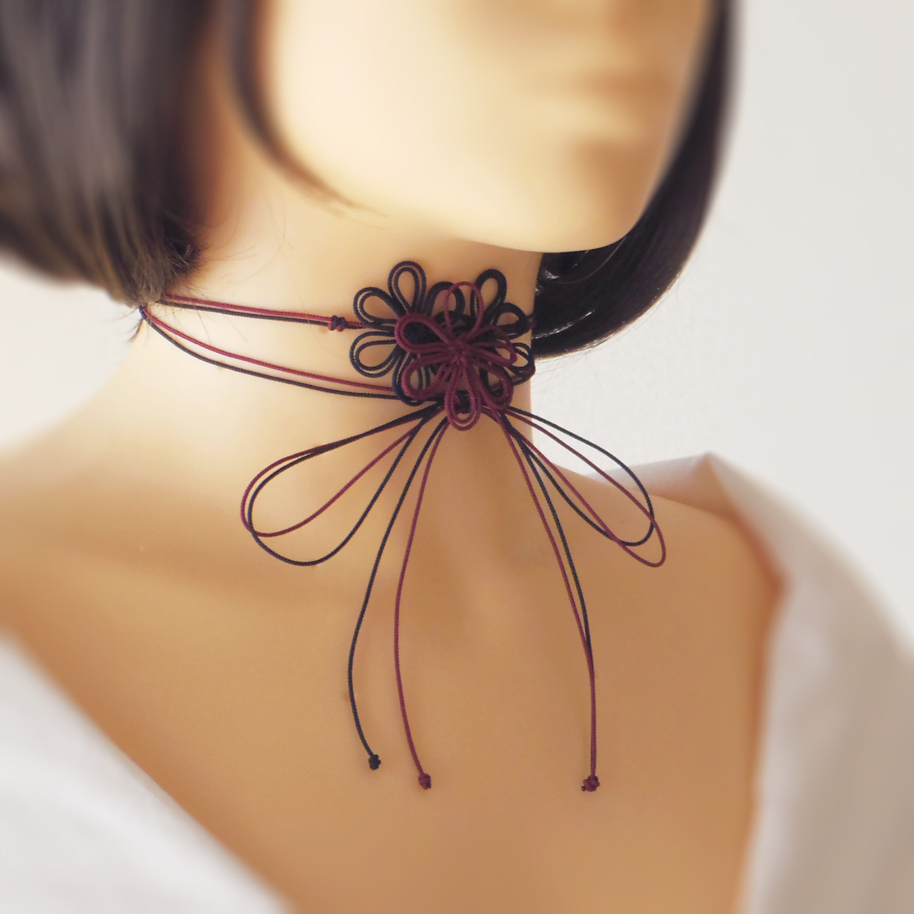 飾り結びチョーカー「気配織ナス」(臙脂×黒)【軽量】浴衣・着物・フォーマル華やぐ二重巻。
