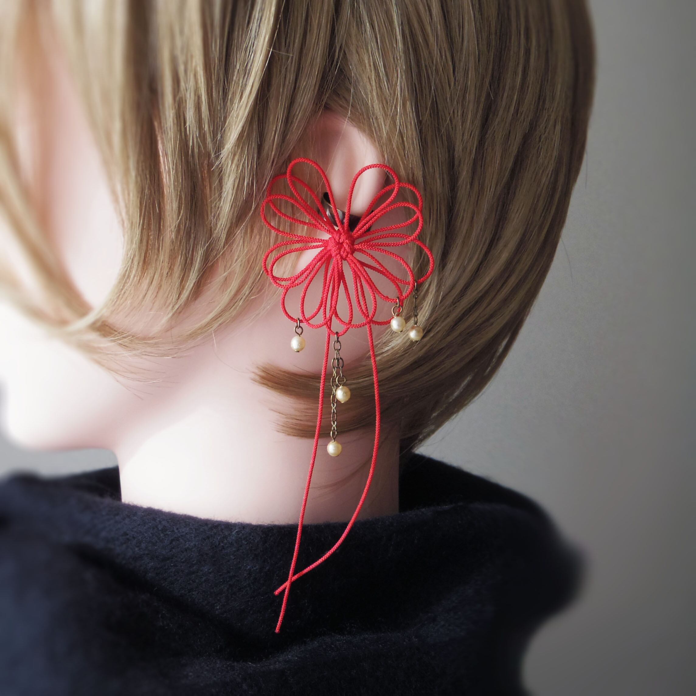 ※金具の破損防止のためお届け時はイヤーカフパーツが飾り結びに対して平行に「倒れて」います。そっとゆっくり起こしてください。90°きっちり起こす必要はありません。※