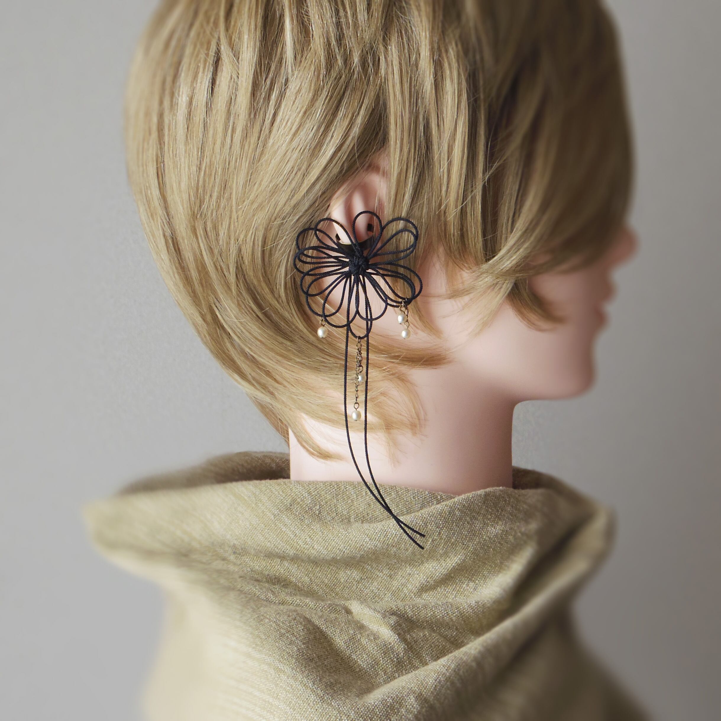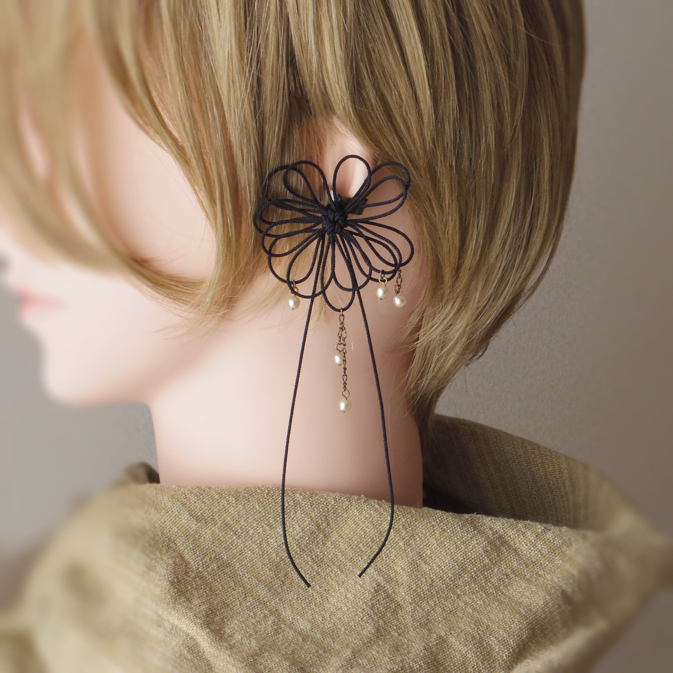 ※ご注意写真も掲載していますが、金具の破損防止のためお届け時はイヤーカフパーツが飾り結びに対して平行に「倒れて」いますのでそっとゆっくり起こしてください。90°きっちり起こす必要はありません。※