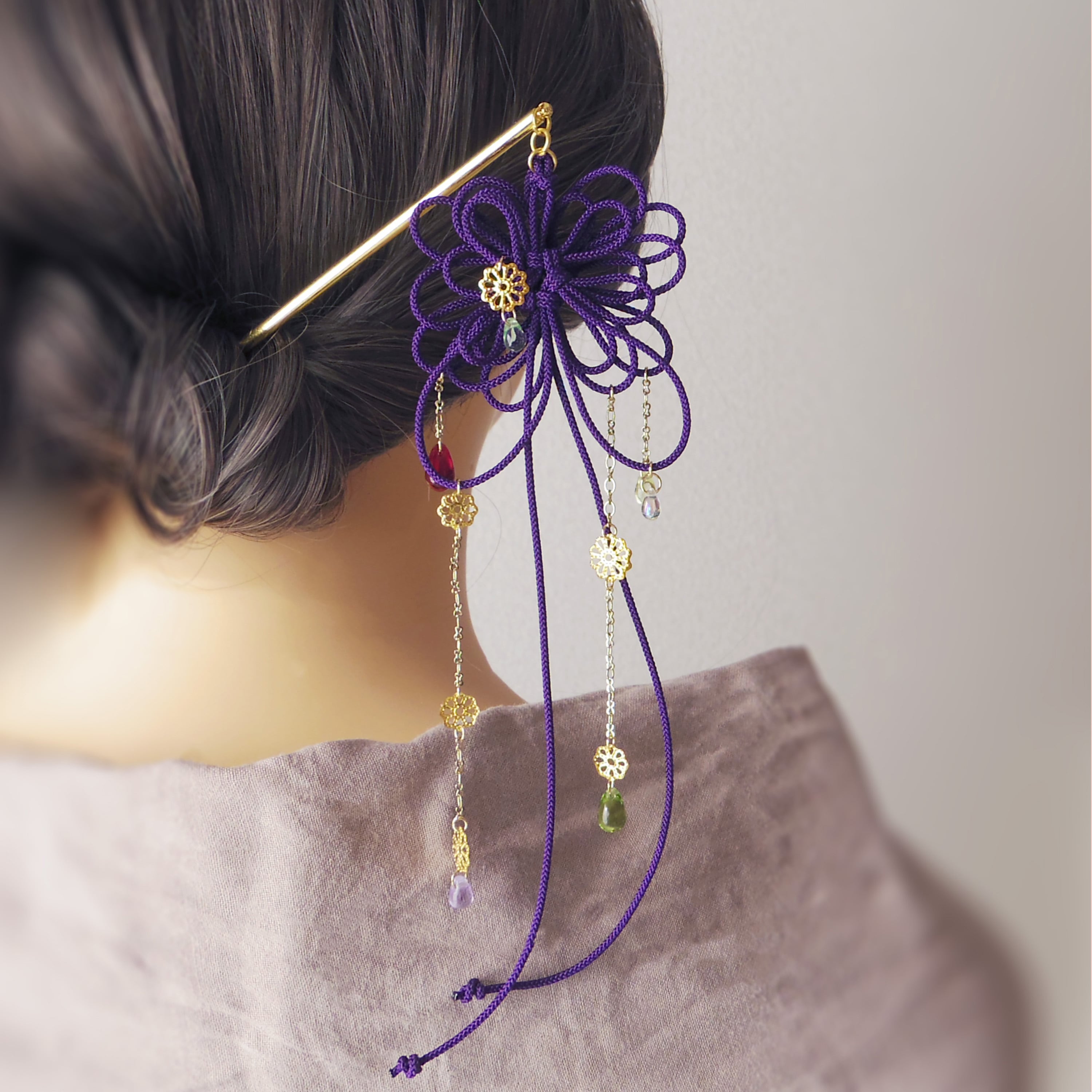 ※かんざしは「軸」を持つようにしてください。飾りを掴まないようにお願いいたします。特に「ひねる」方向には大変弱いです。