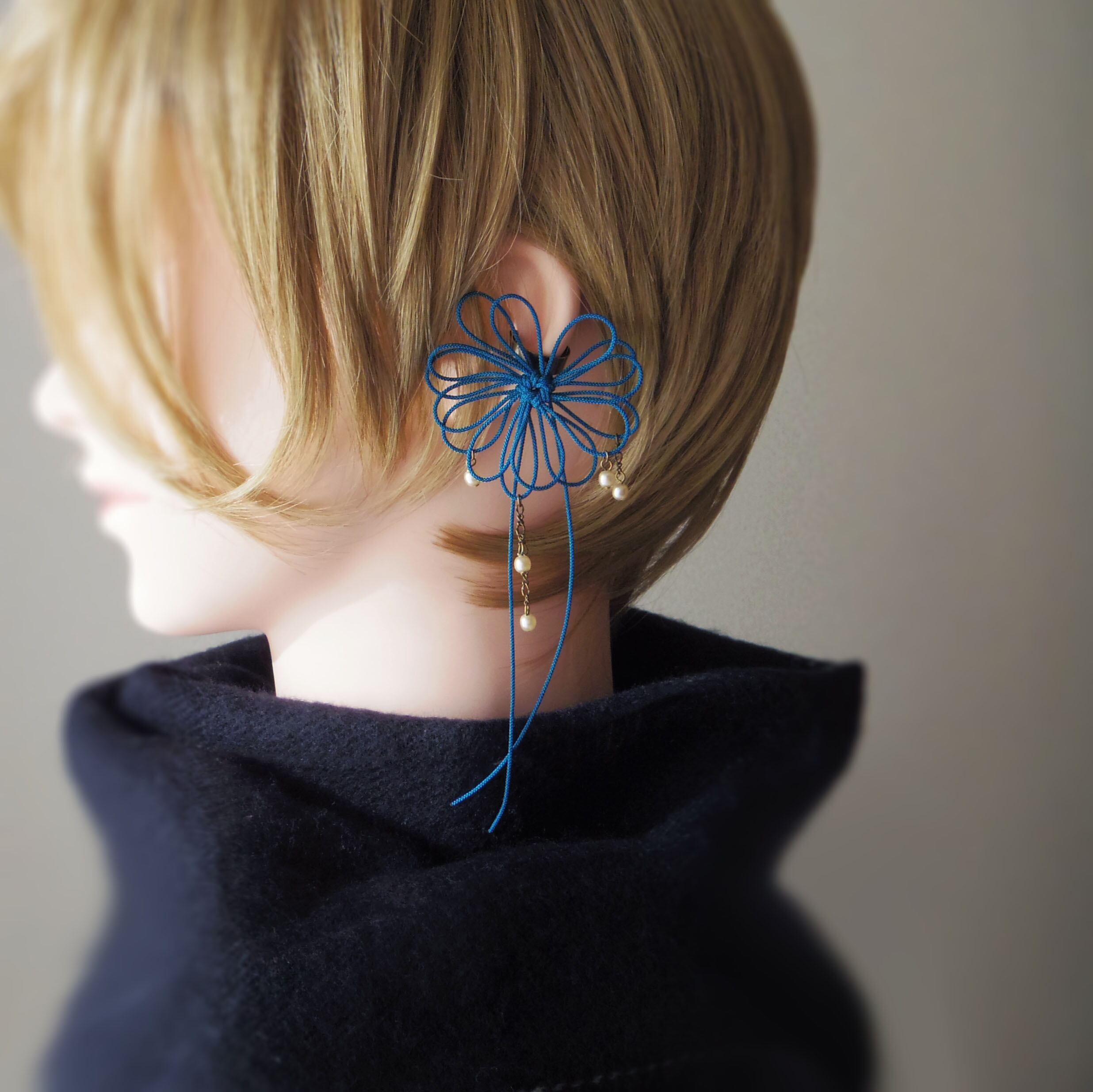 ※ご注意写真も掲載していますが、金具の破損防止のためお届け時はイヤーカフパーツが飾り結びに対して平行に「倒れて」いますのでそっとゆっくり起こしてください。90°きっちり起こす必要はありません。※