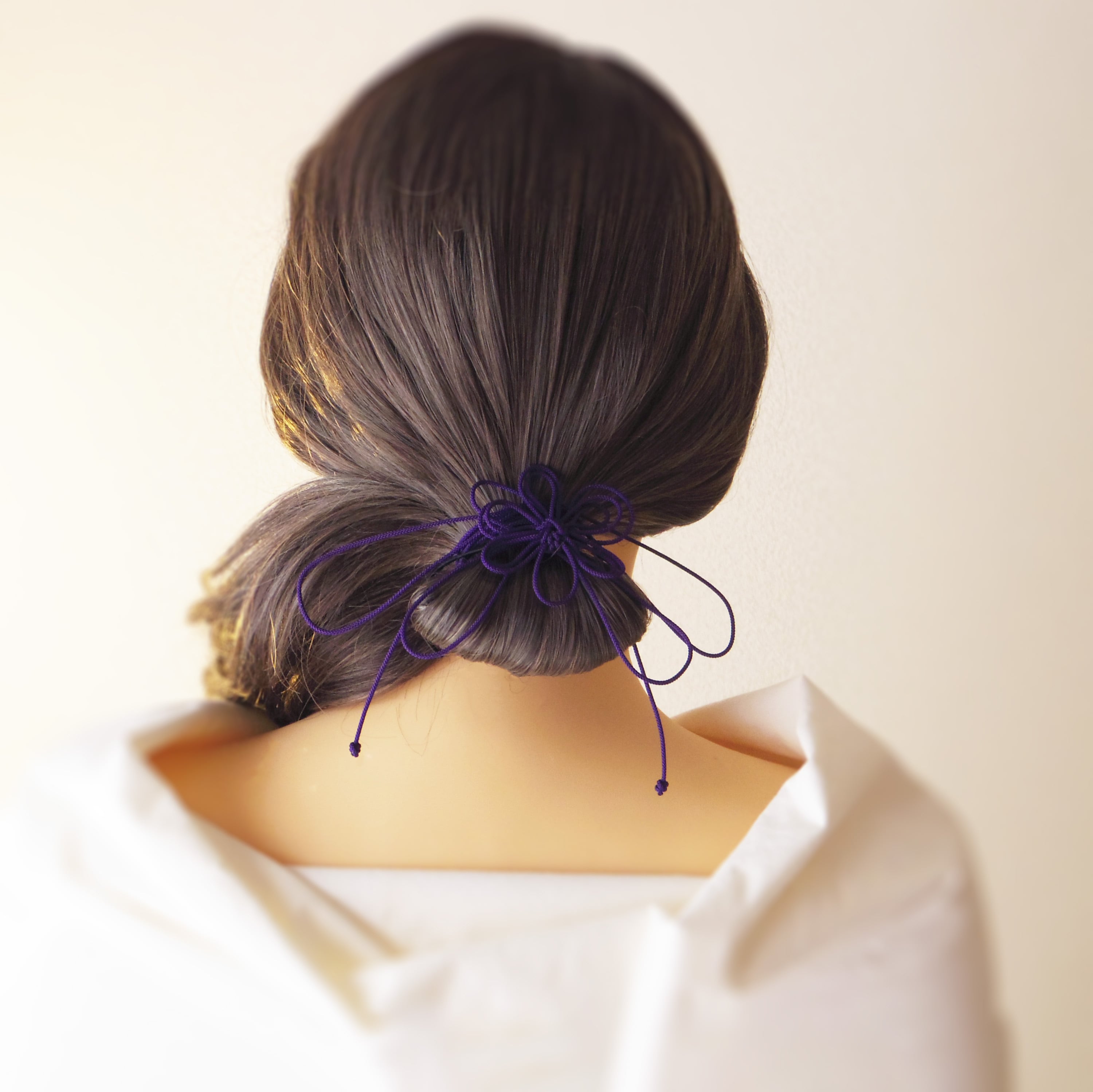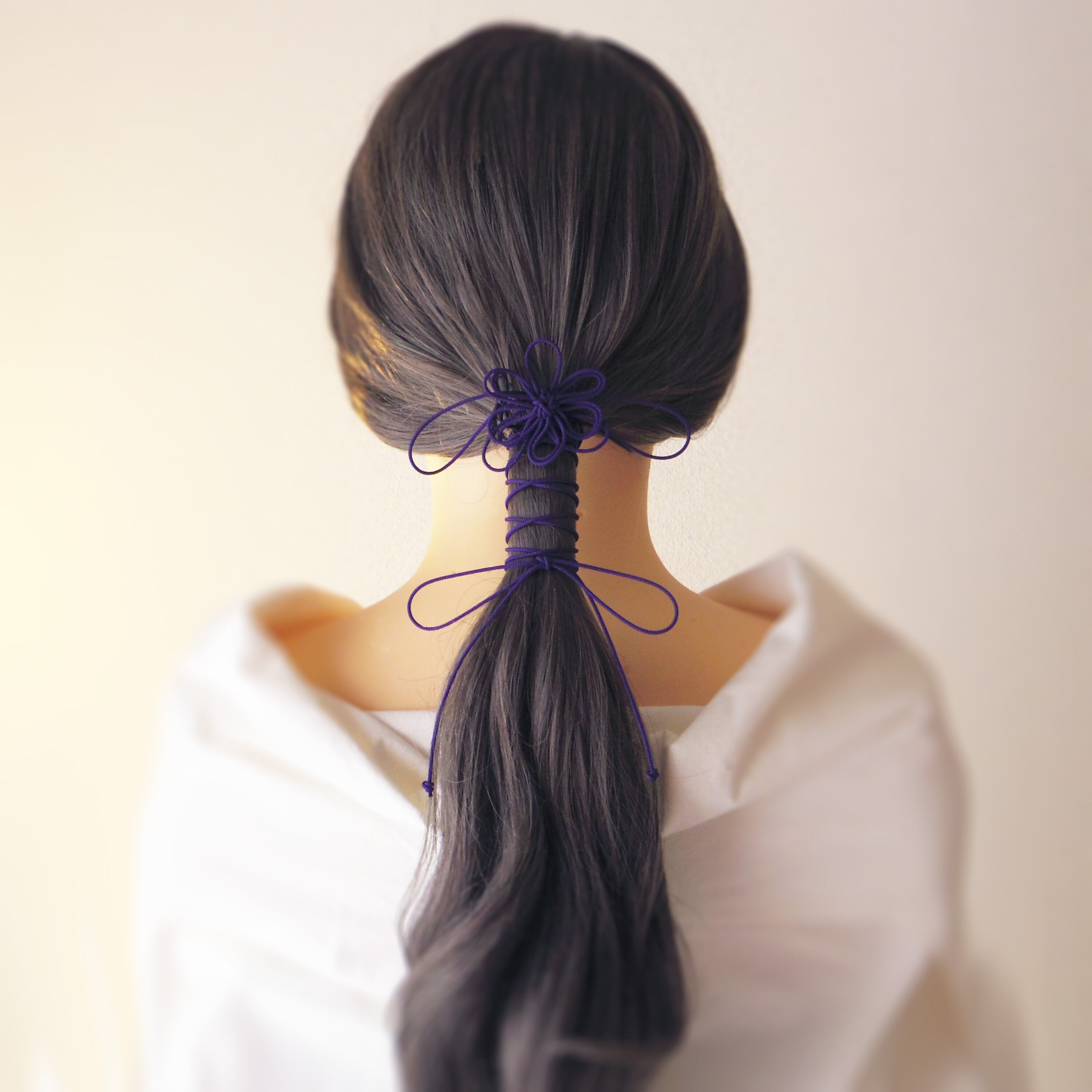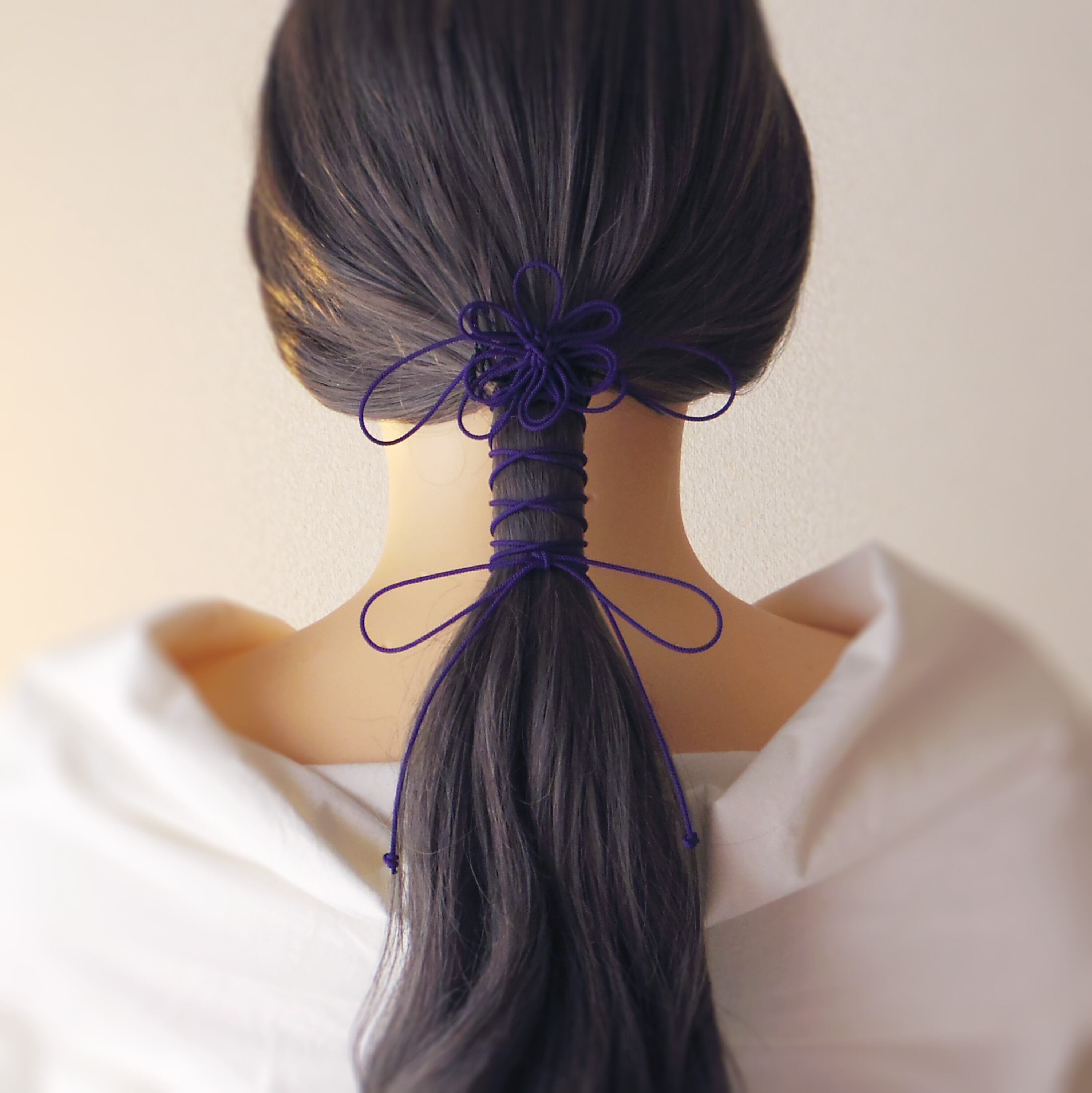 まず最初にゴム部分で髪をまとめ、垂れている紐部分をそのゴム部分の上から巻きつけて使用することにより「和」な雰囲気のまとめ髪を楽しもうと言う趣向で作りました