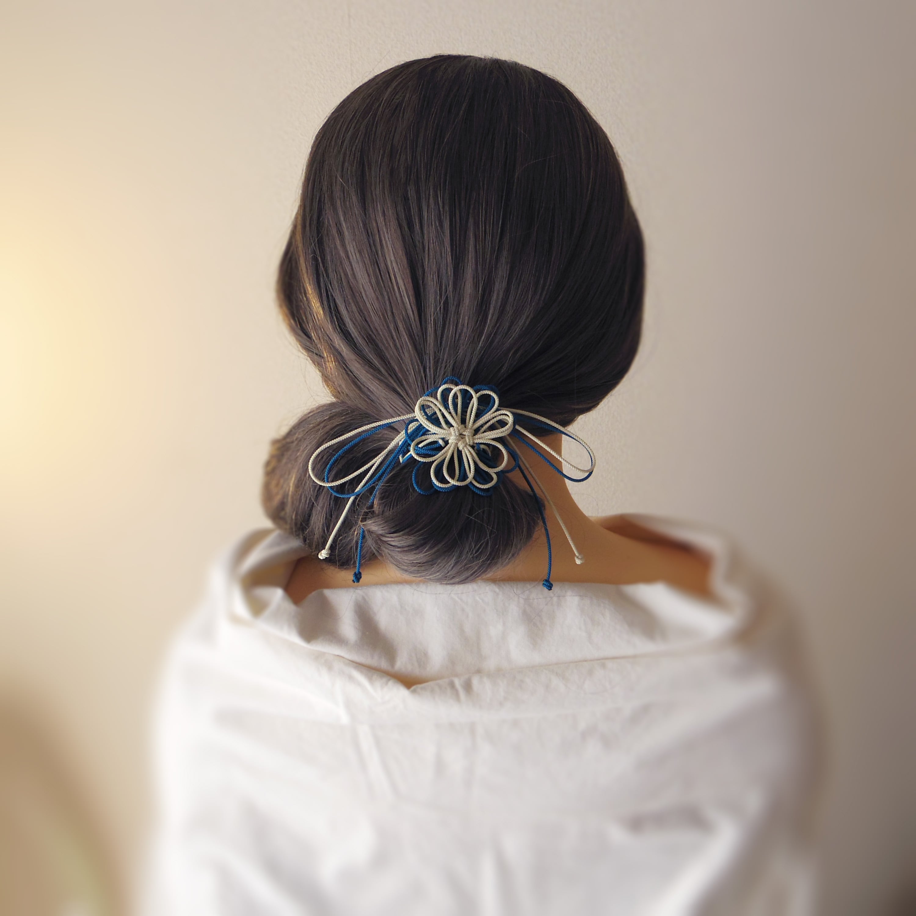 飾り結びヘアゴム「りりきらり、君」(アイボリー×淡青)|着物・浴衣に簡単アレンジで和装ヘア