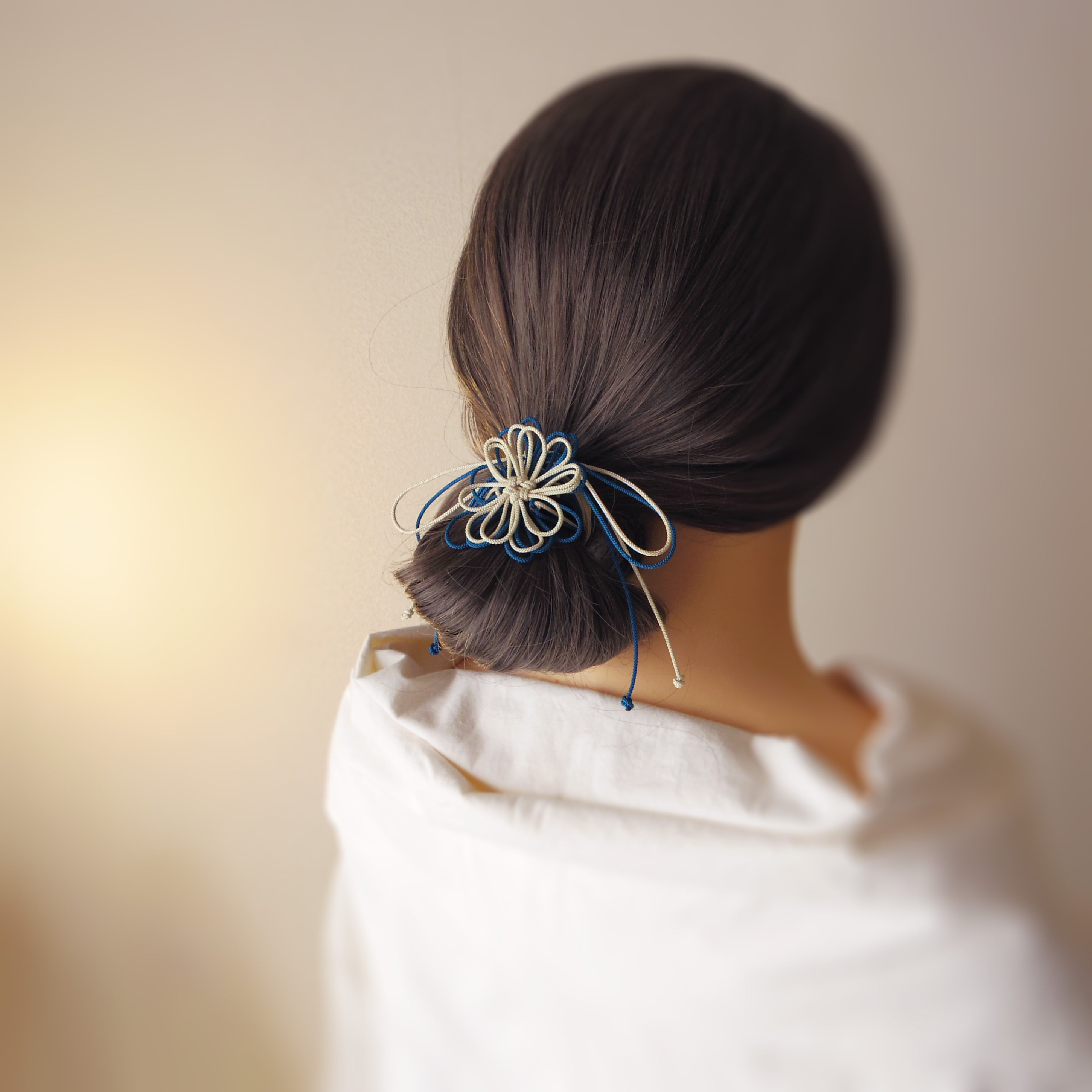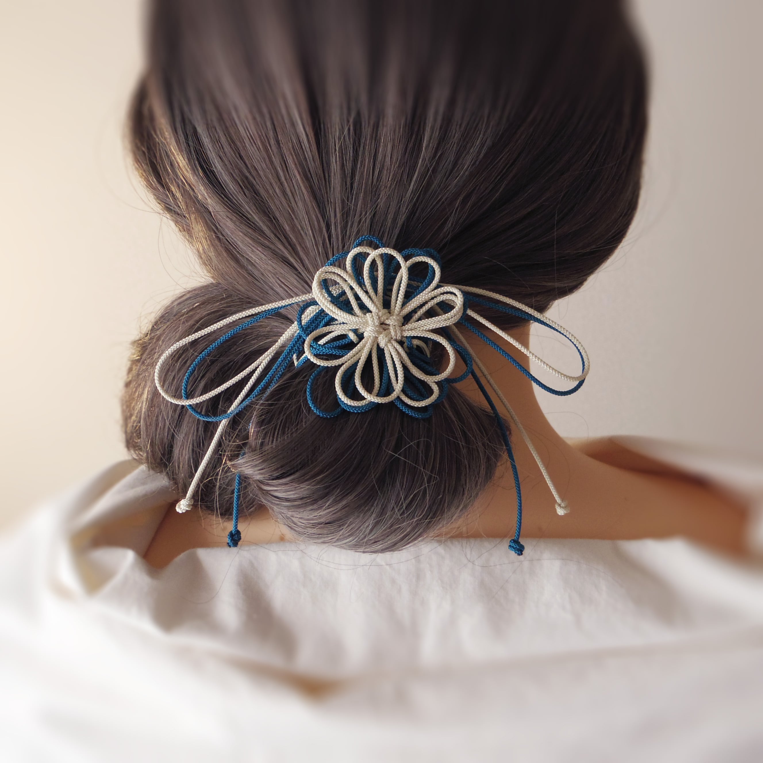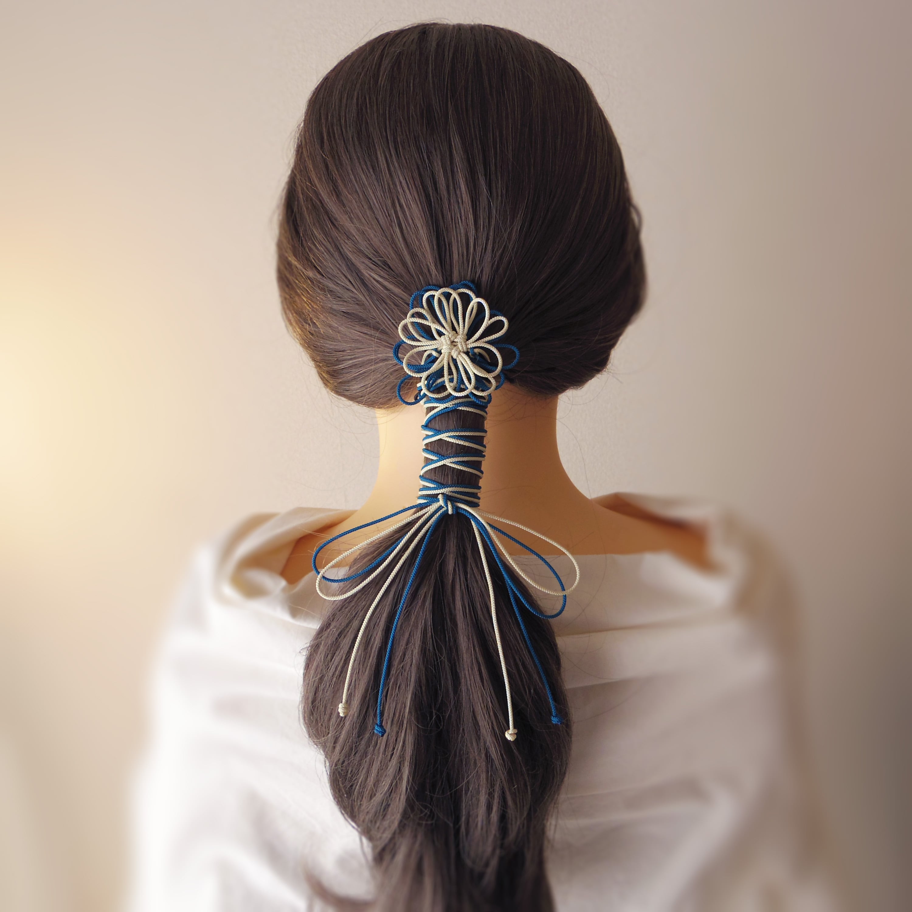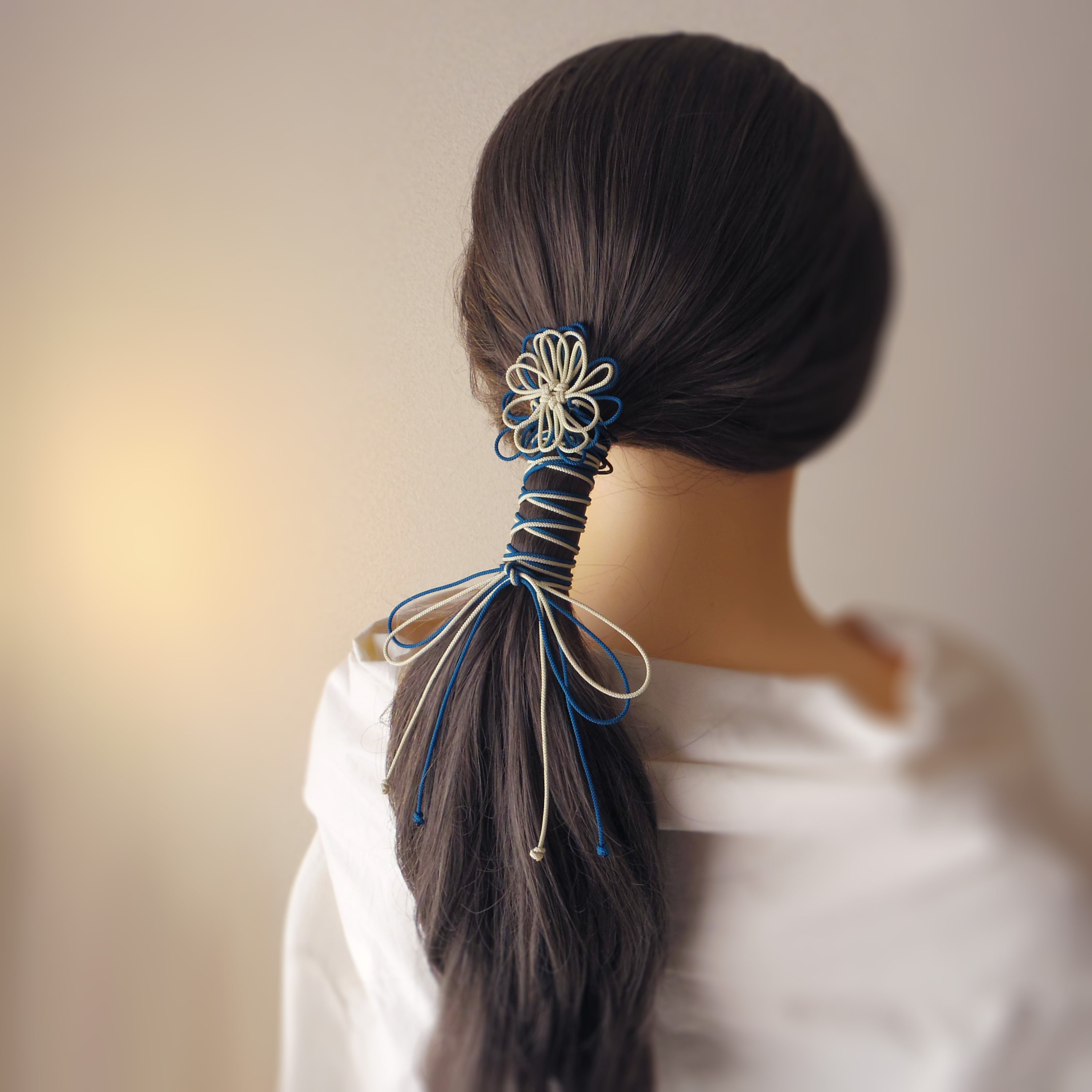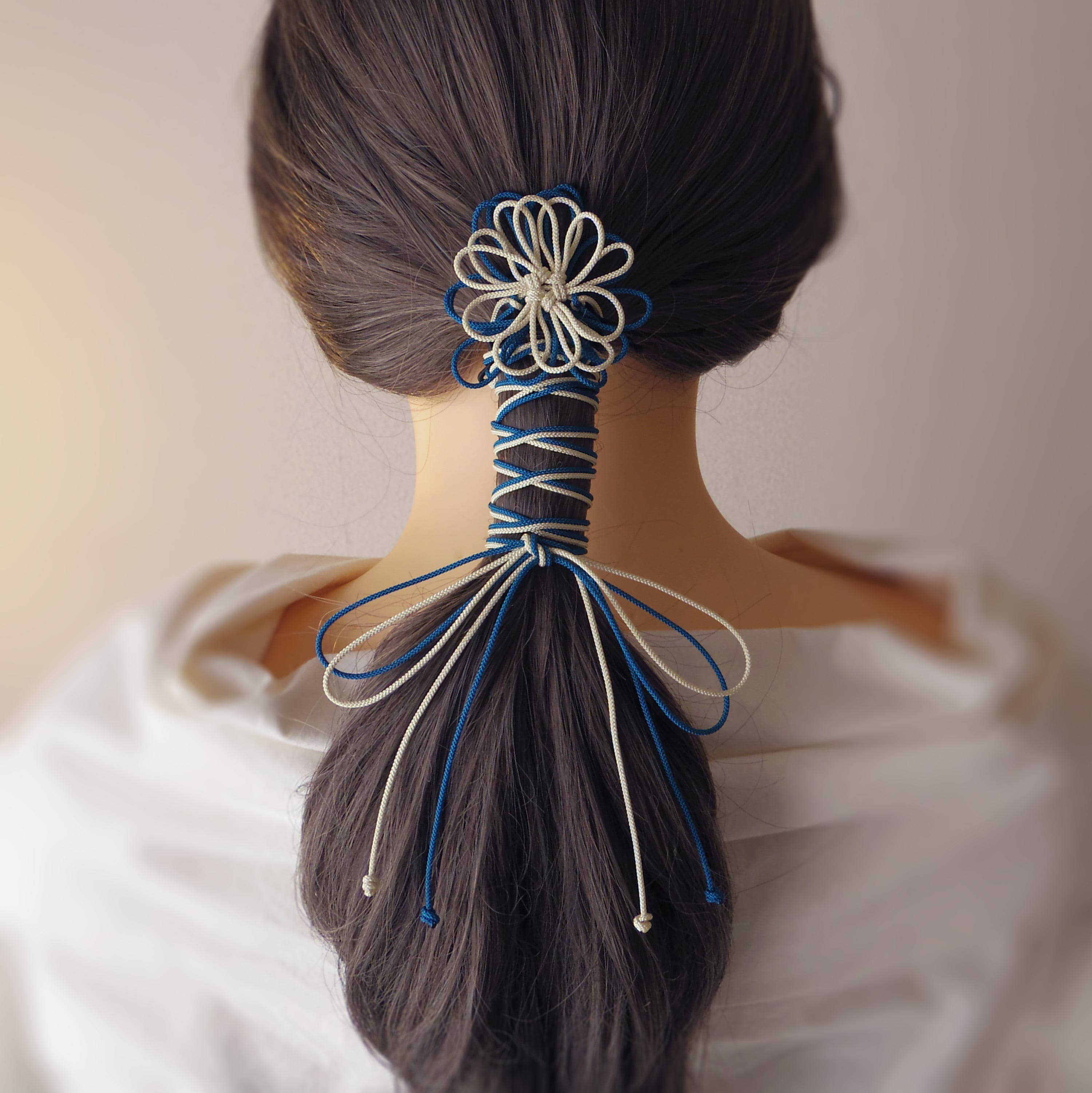 The strong yet gentle contrast highlights each color beautifully, while the unpolished warmth of the ivory adds a comforting, canvas-like softness.It evokes the crisp, refreshing feeling of cool air and dry wind — a dignified, tightened heart that feels supported by gentle warmth.☆ This accessory uses the traditional Japanese “decorative knotting” technique. Please note that it is completely different from mizuhiki (paper cord) or kumihimo (braided cord).※ First secure your hair with the elastic, then wrap the hanging cords over it. Please refer to the attached images for how to use. We cannot answer individual questions about the usage method.※ The decorative knot is very delicate. When putting it on or taking it off, please pull only the elastic part and avoid applying force to the knot itself.※ The shape and length of the decorative knot may vary slightly from the photos.Size