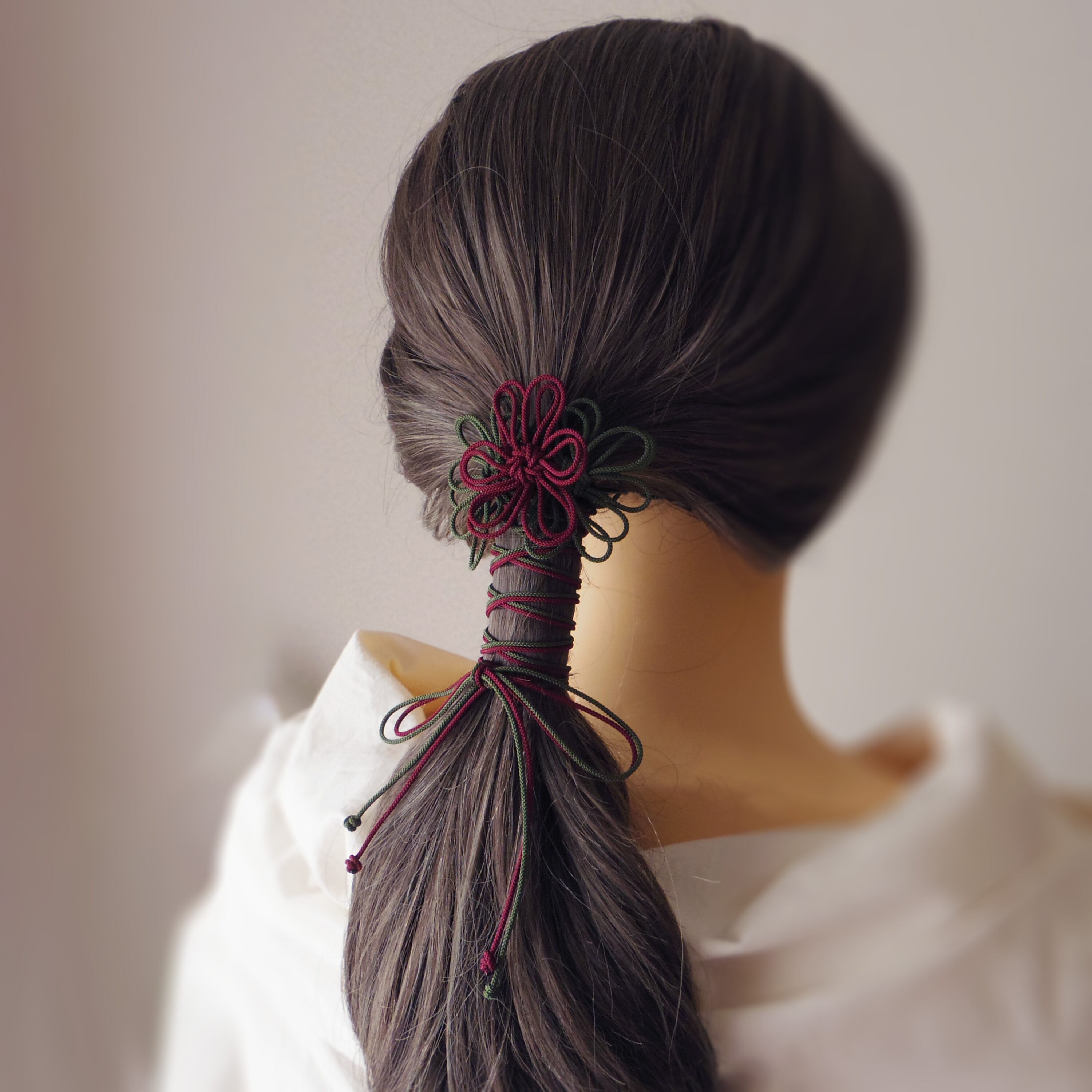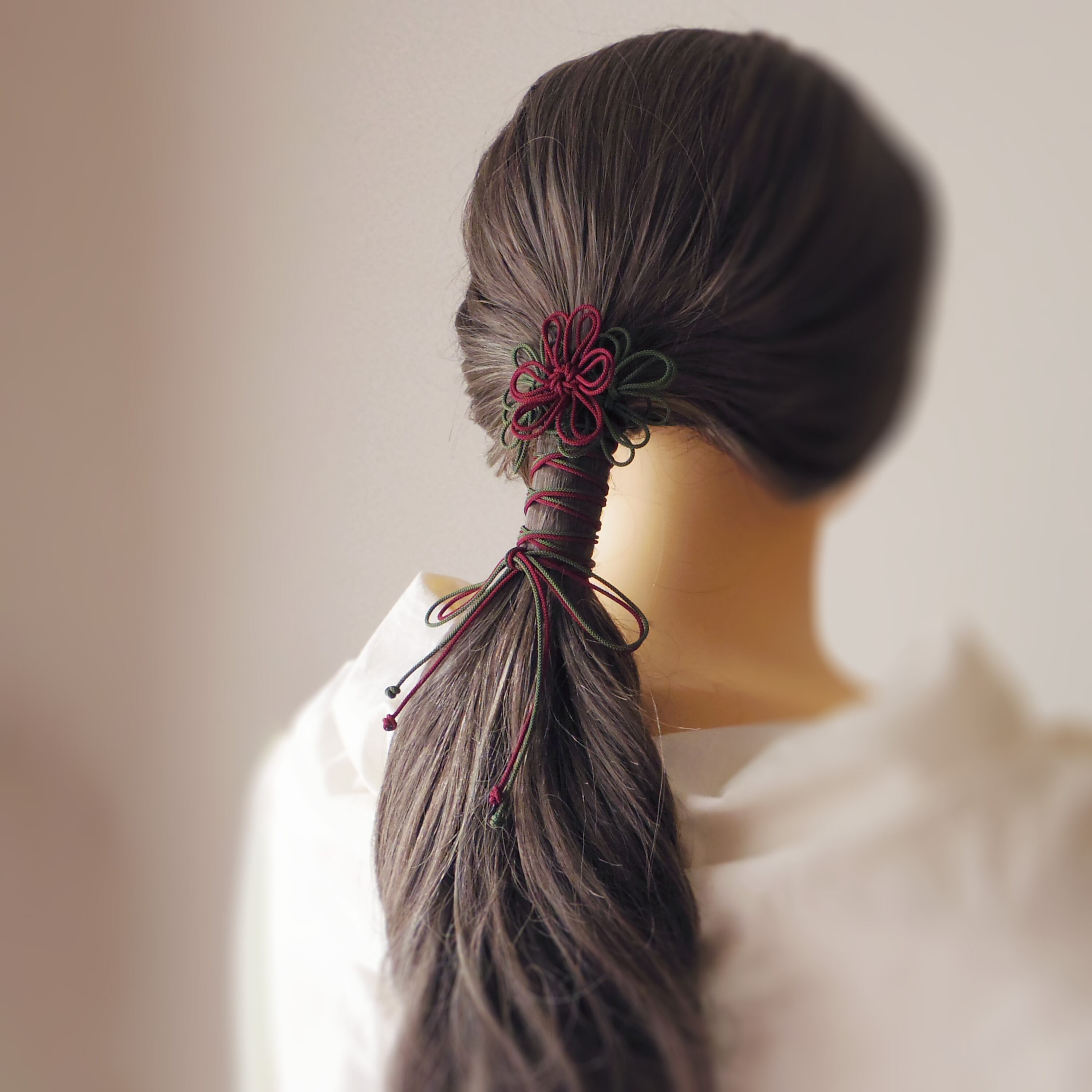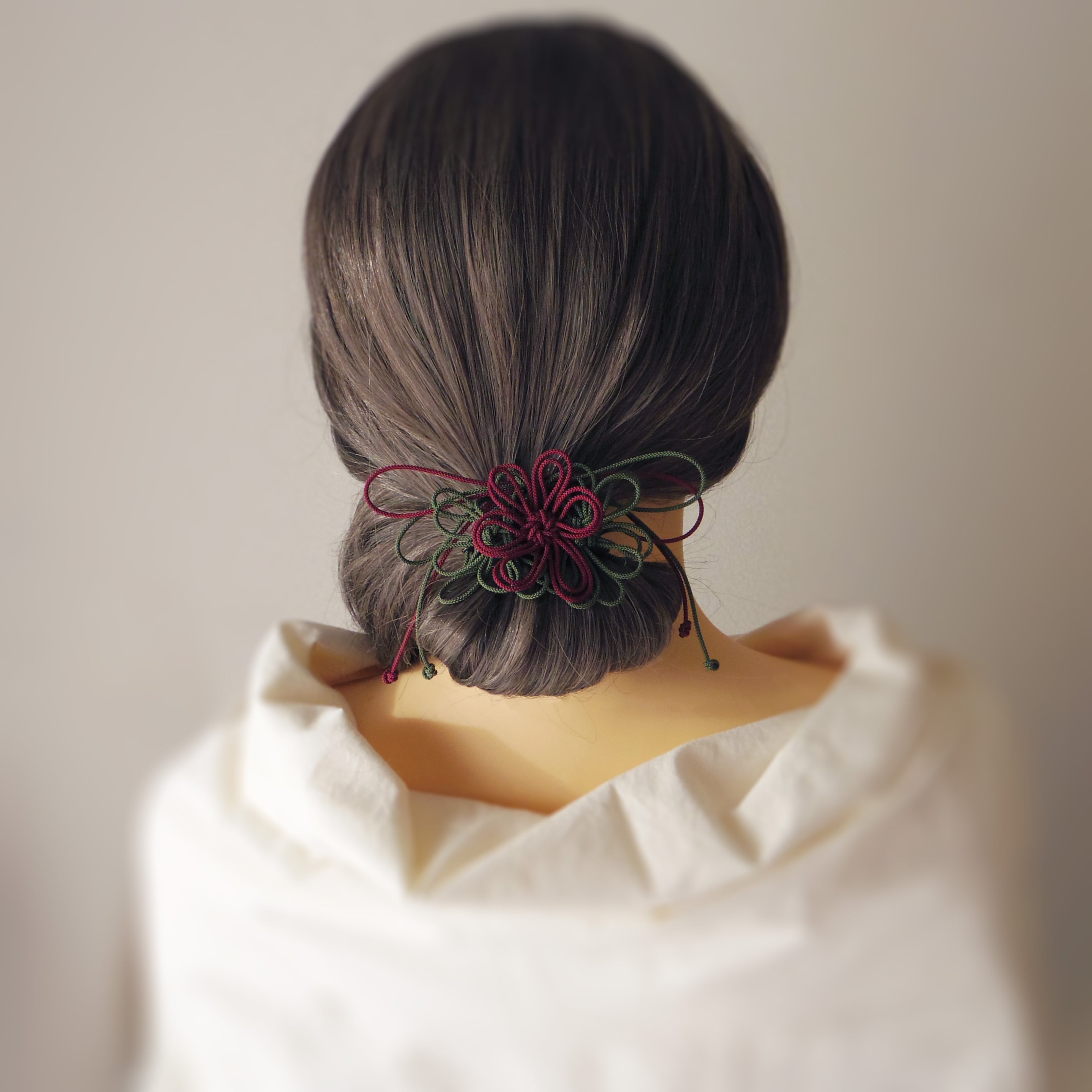 飾り結びヘアゴム「音ハ背ニ触レ」(臙脂×深緑)|着物・浴衣に簡単アレンジで和装ヘア