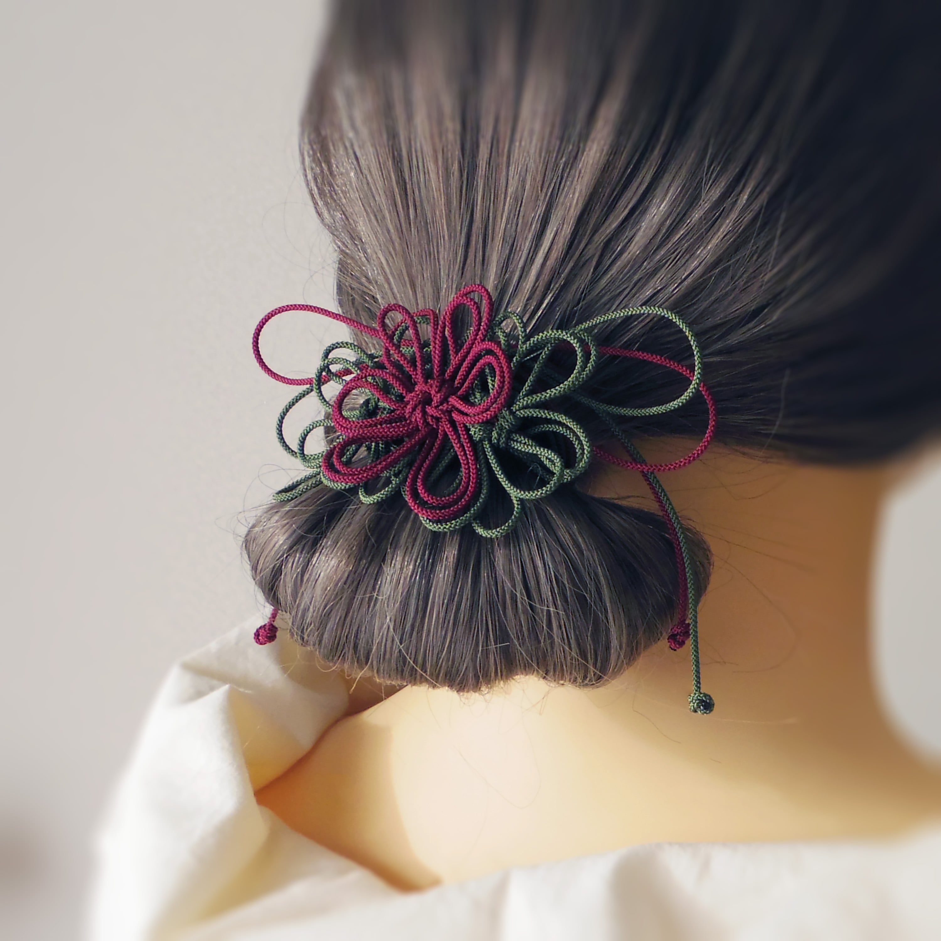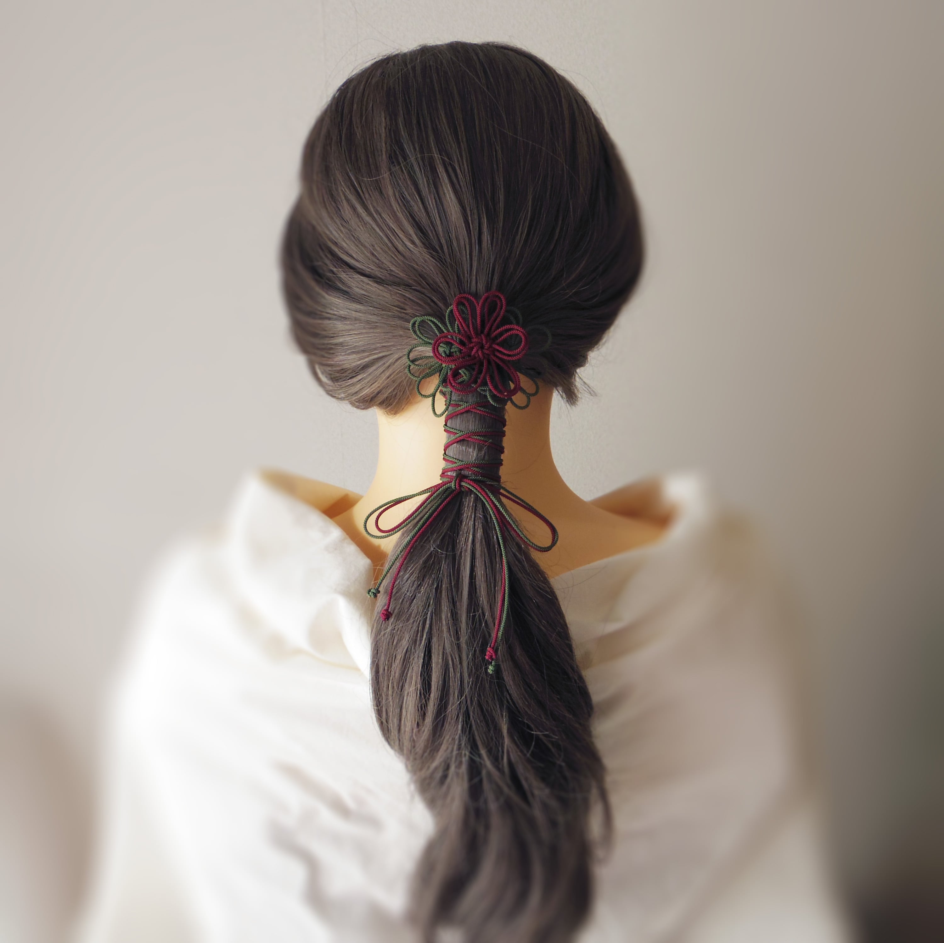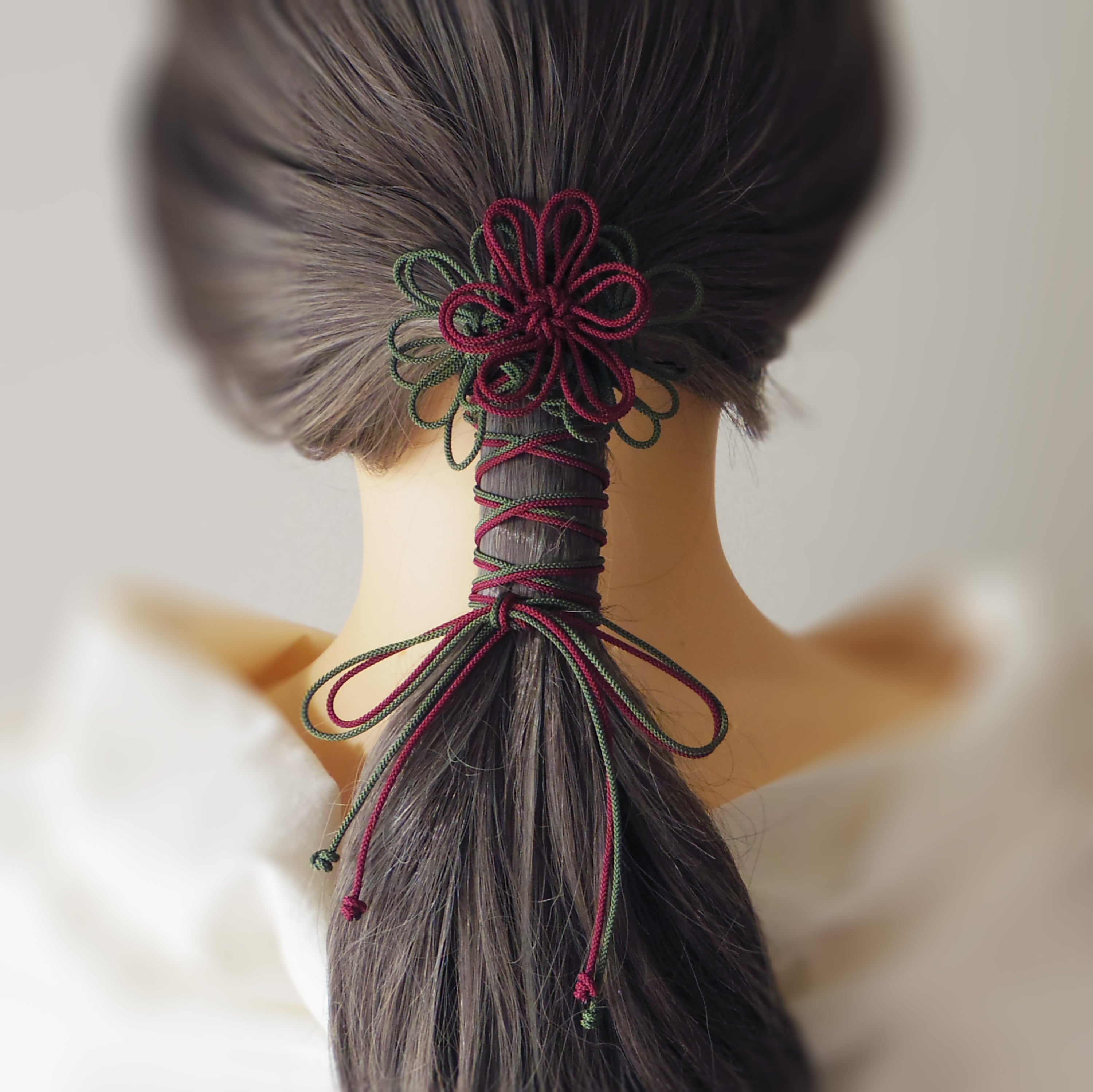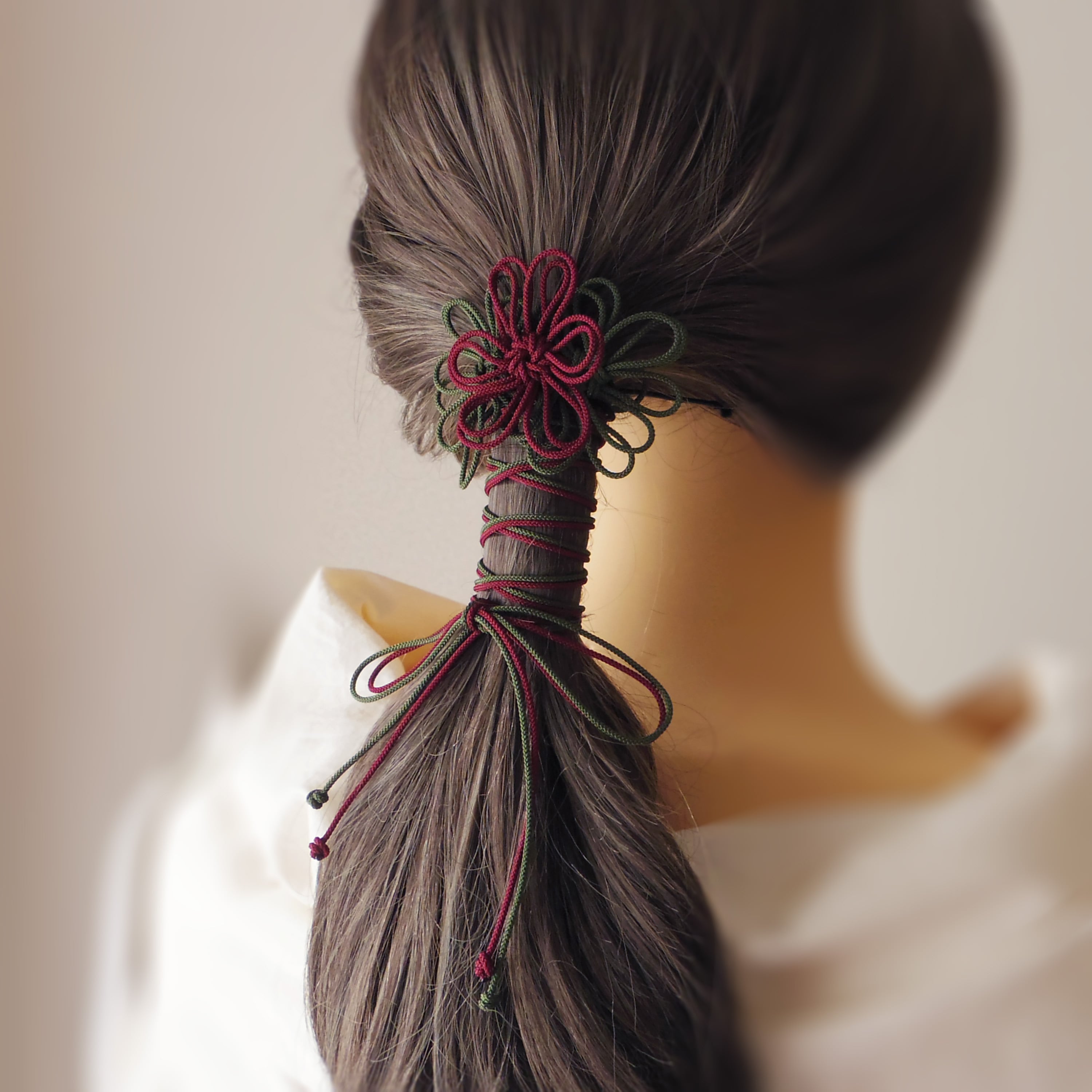 飾り結びヘアゴム「音ハ背ニ触レ」(臙脂×深緑)|着物・浴衣に簡単アレンジで和装ヘア