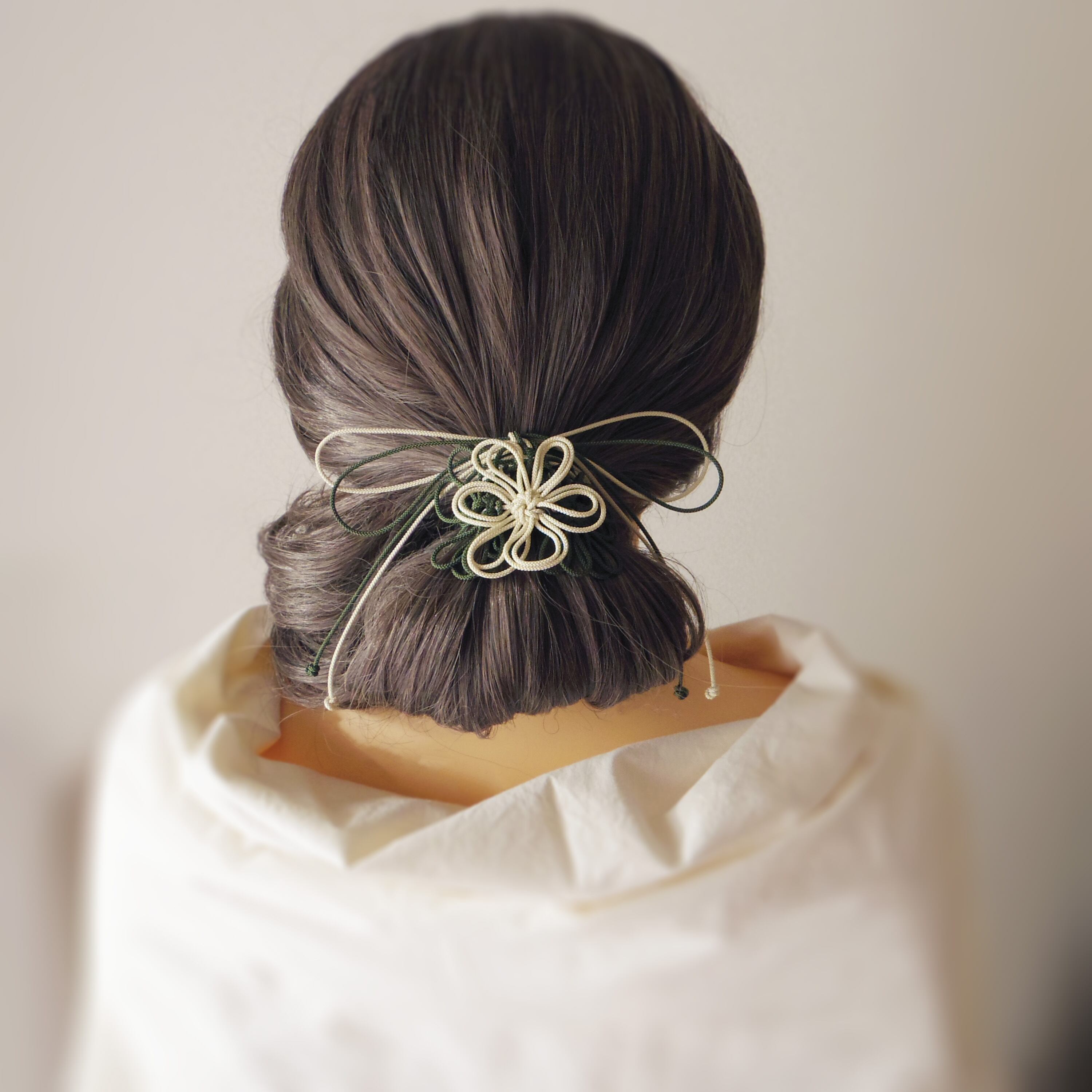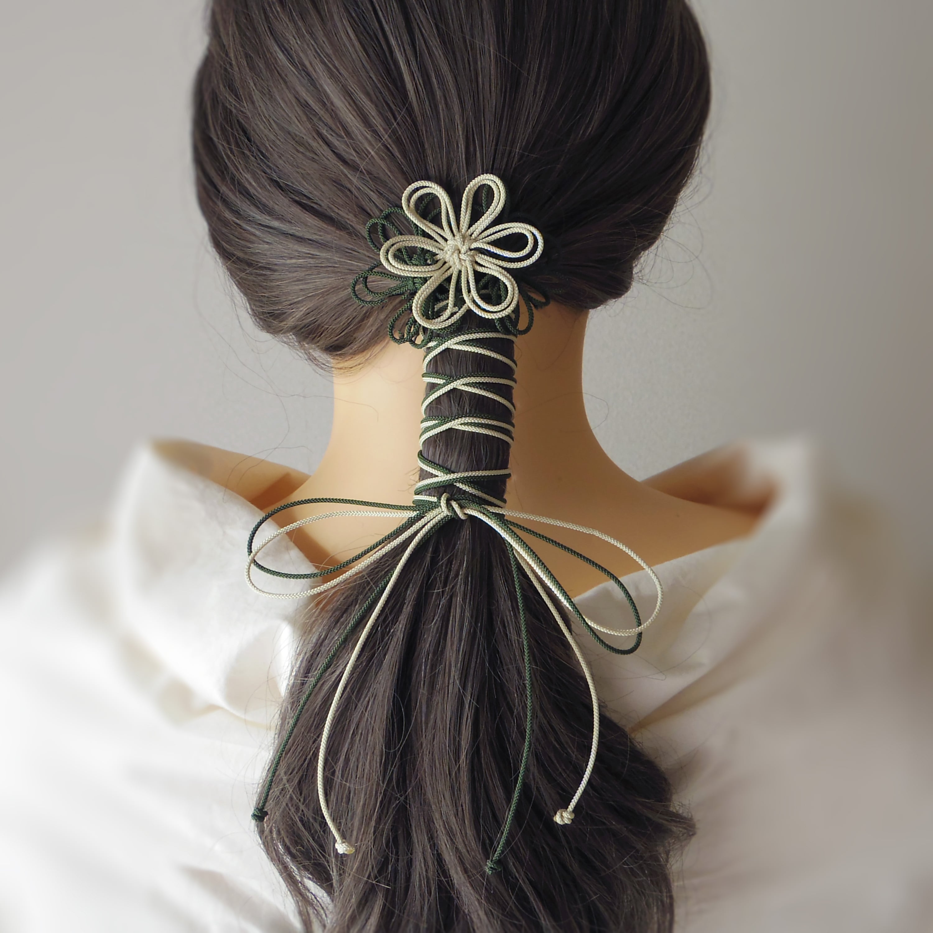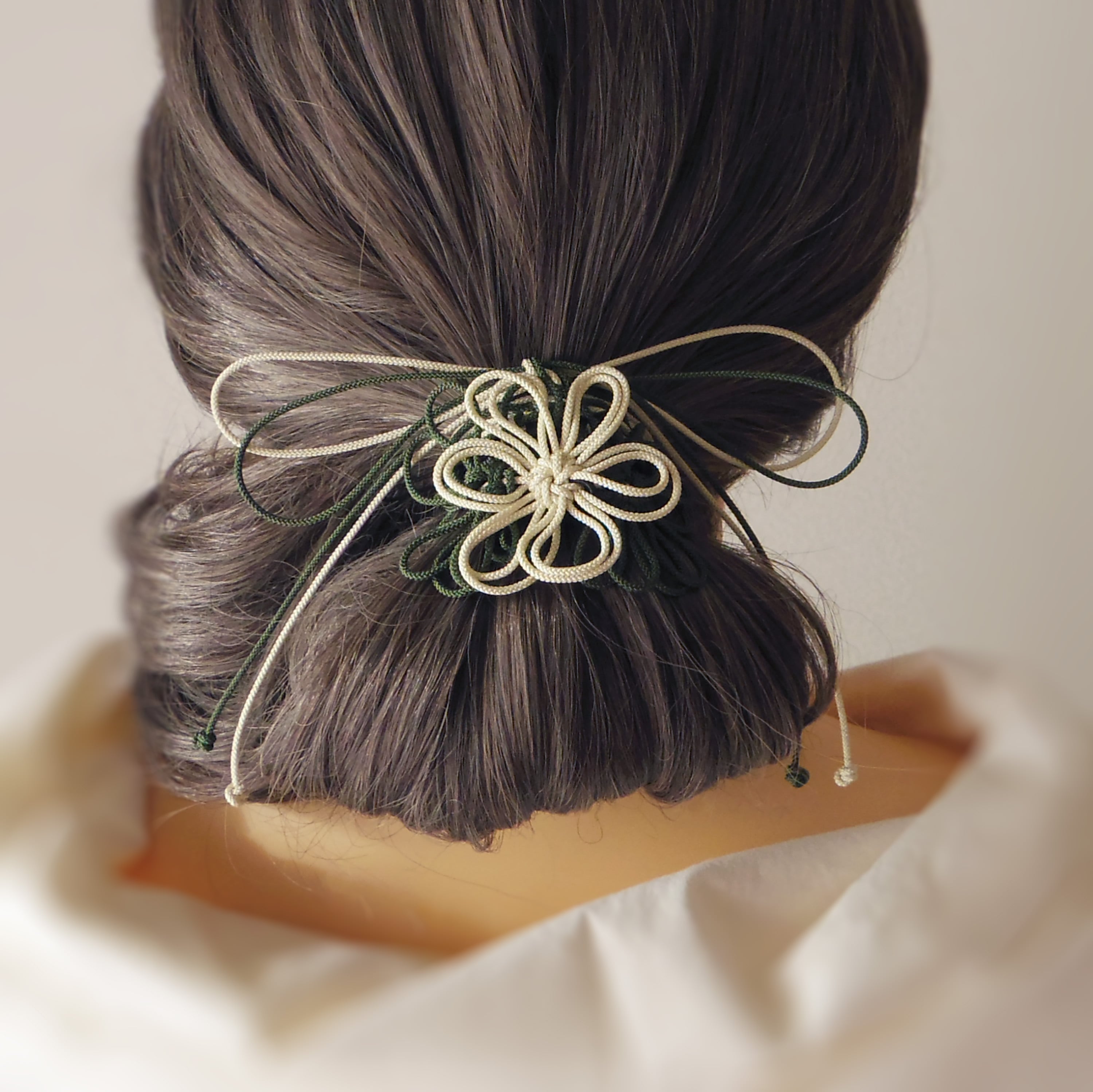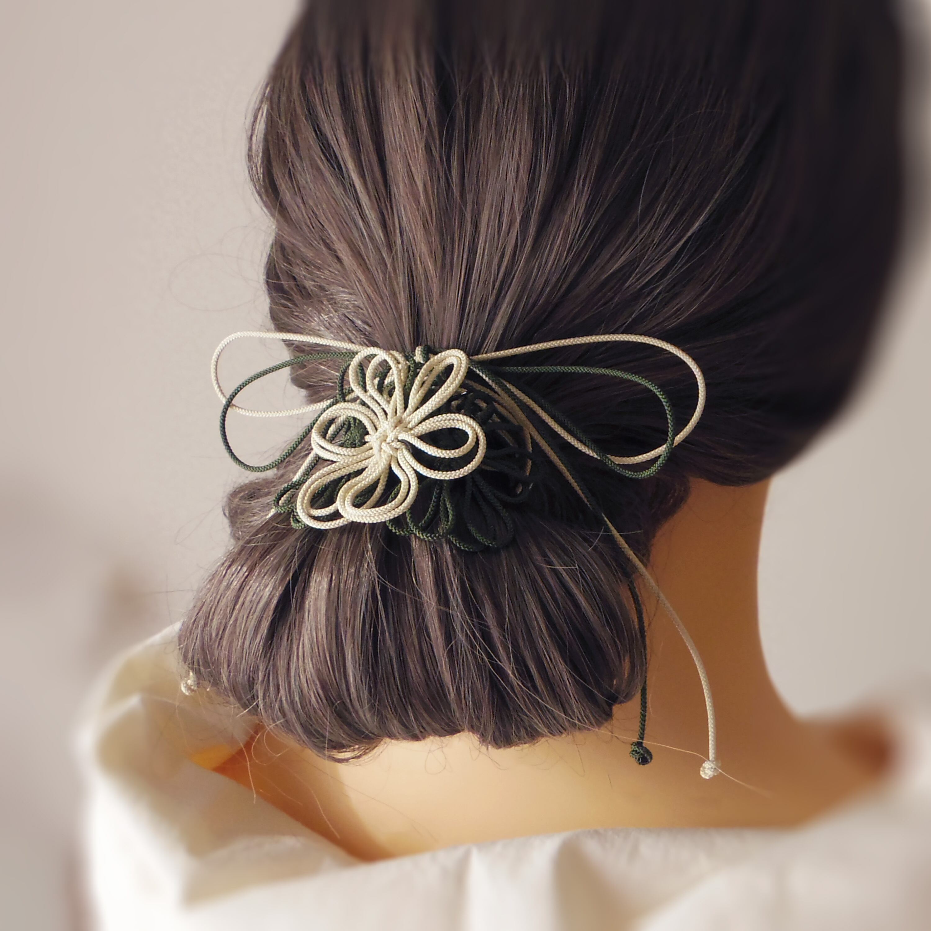 飾り結びヘアゴム「詩ハ世ニ延ベ」(アイボリー×深緑)|着物・浴衣に簡単アレンジで和装ヘア