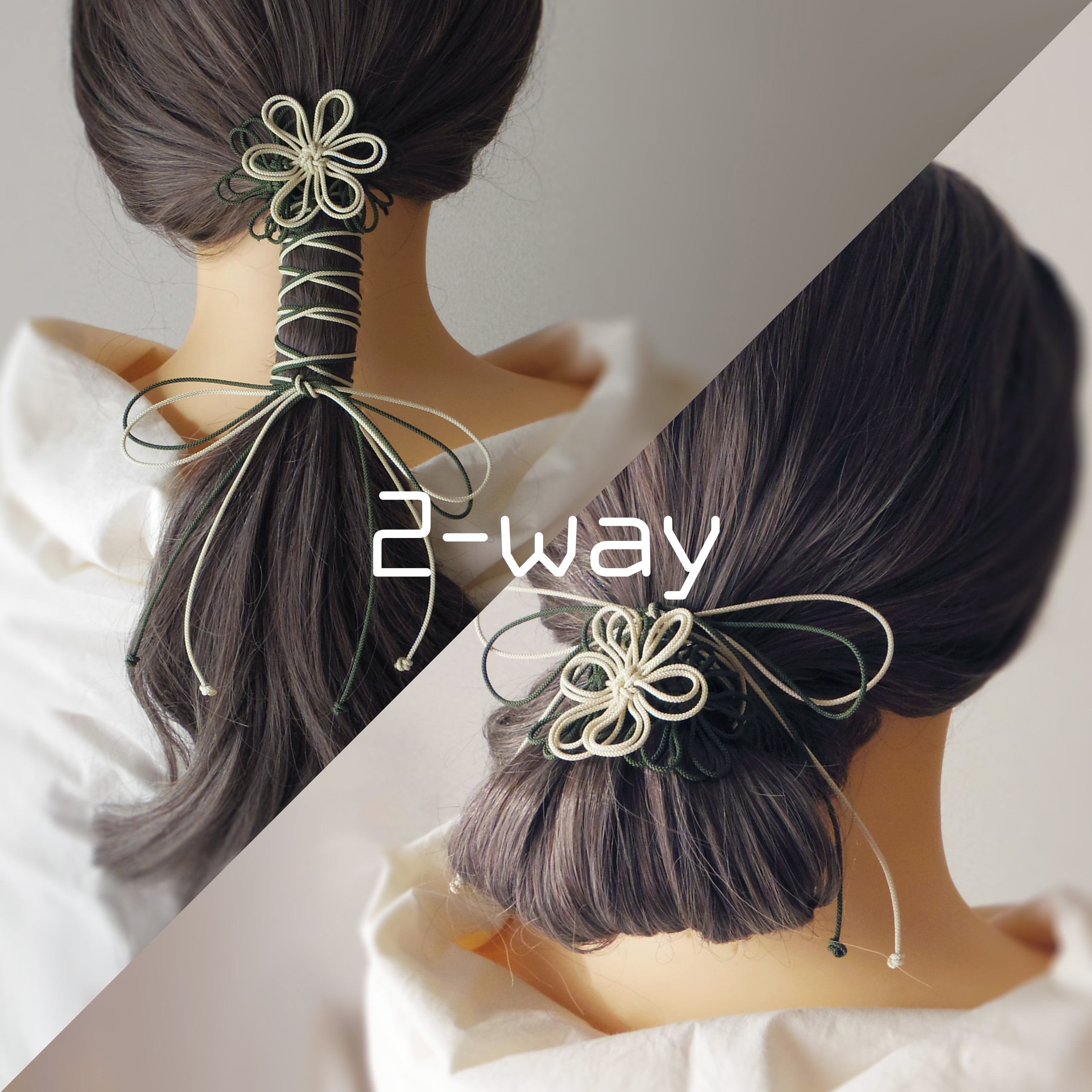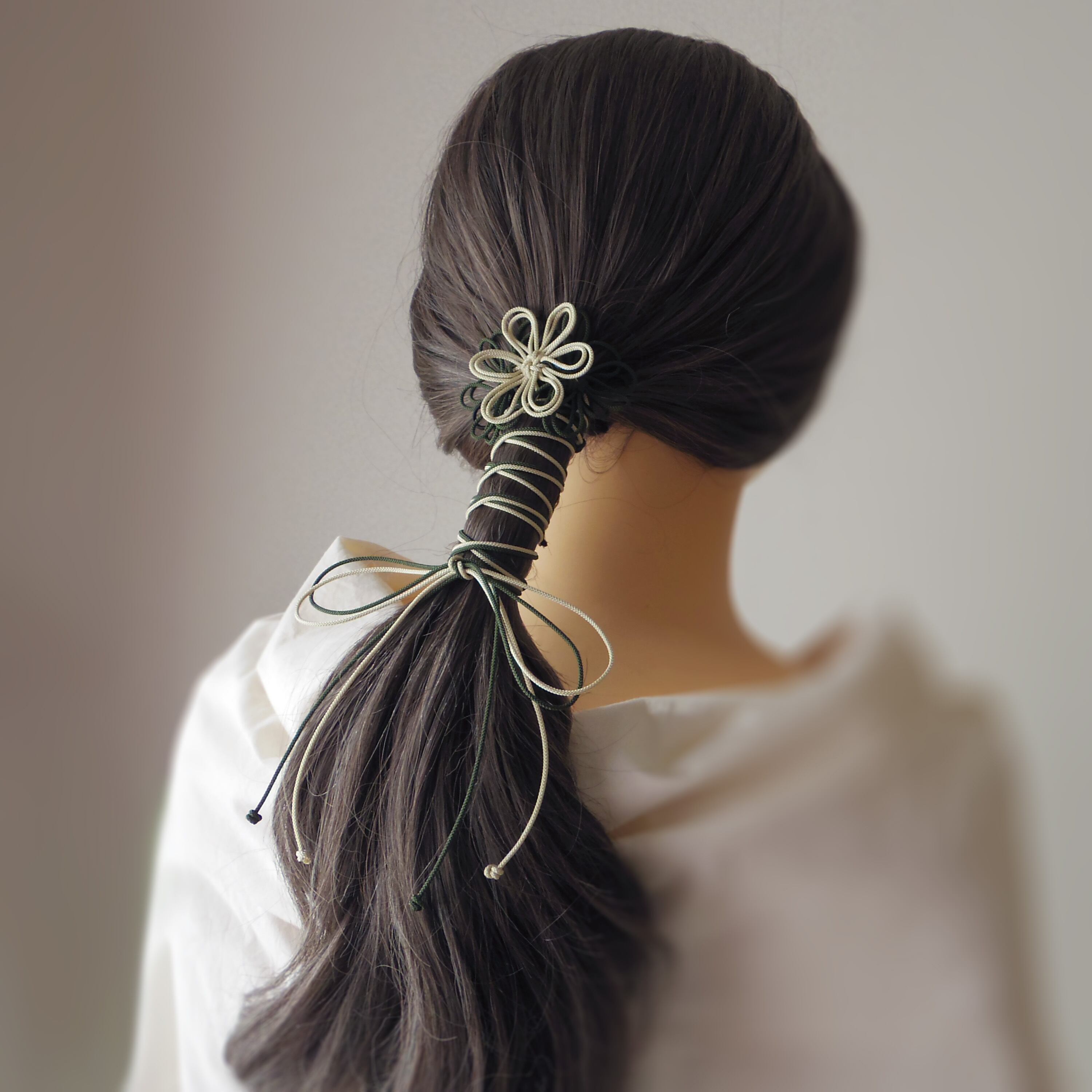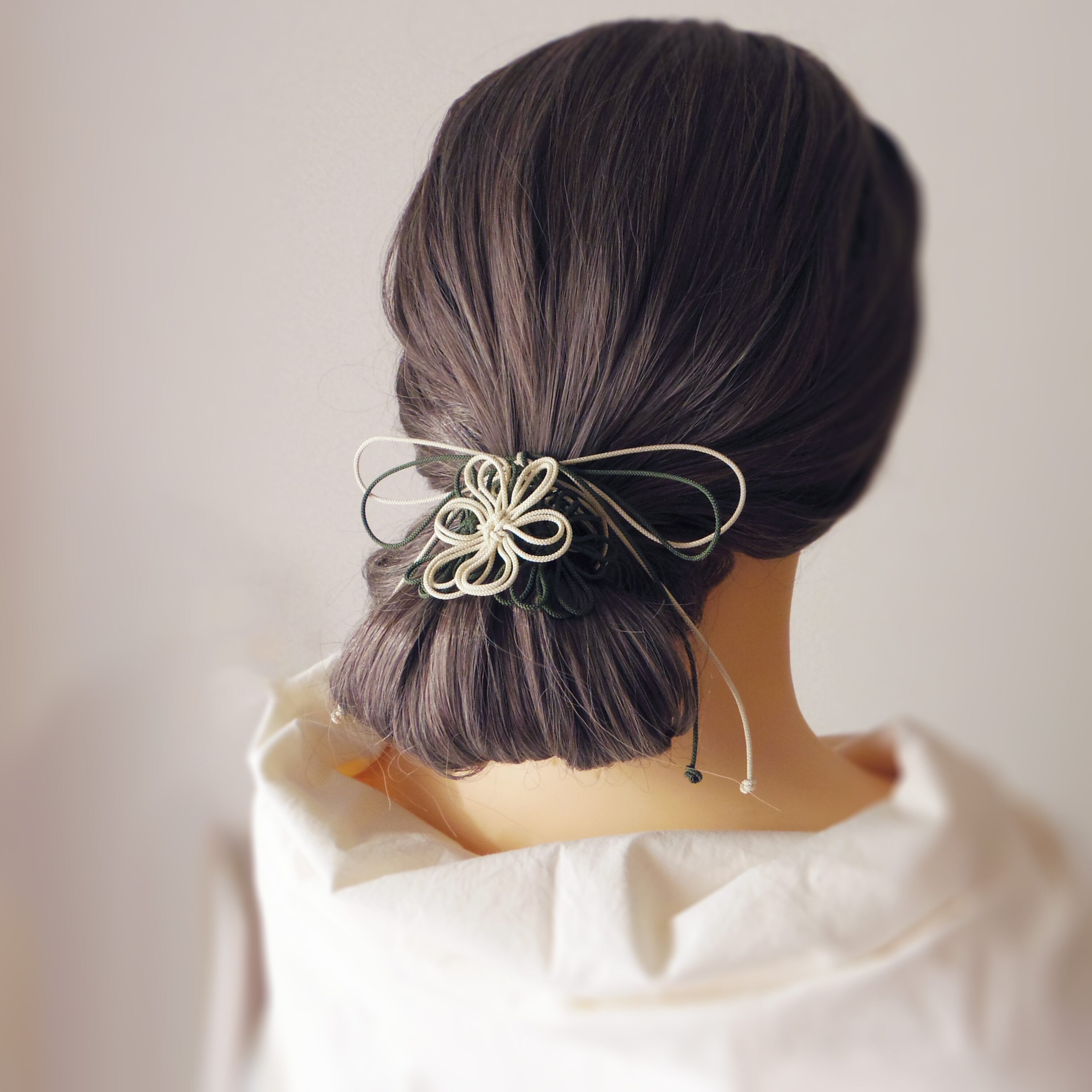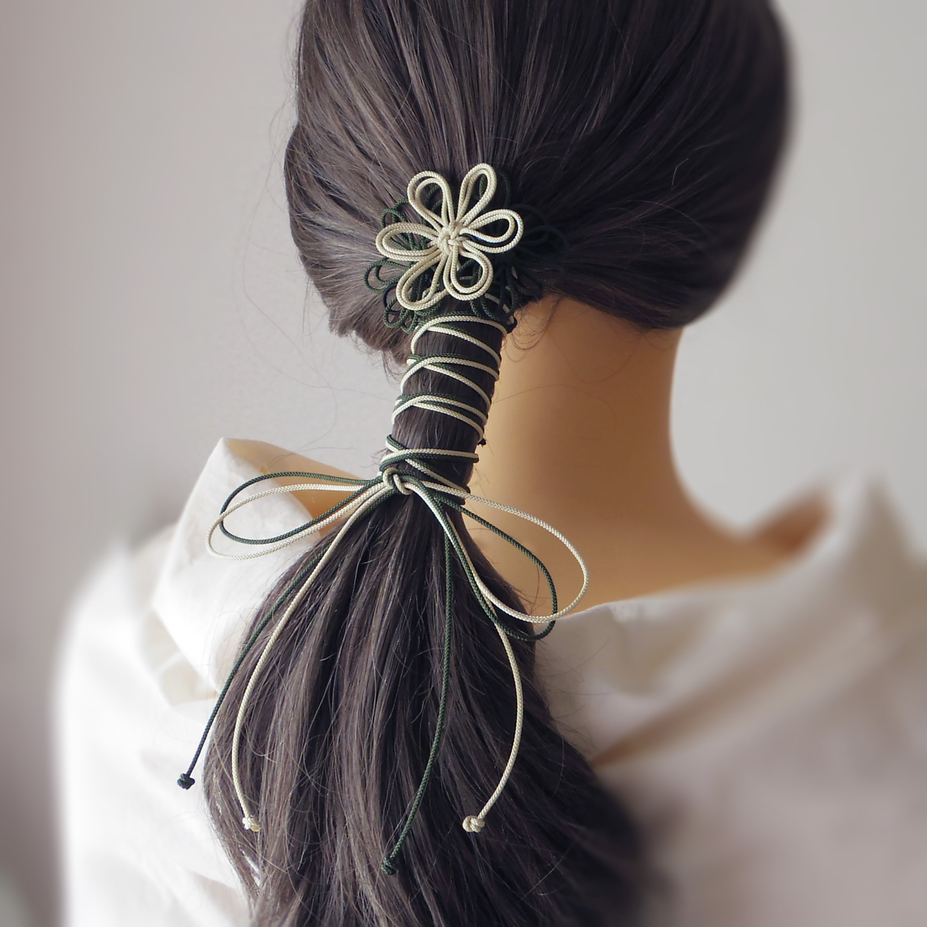 飾り結びヘアゴム「詩ハ世ニ延ベ」(アイボリー×深緑)|着物・浴衣に簡単アレンジで和装ヘア